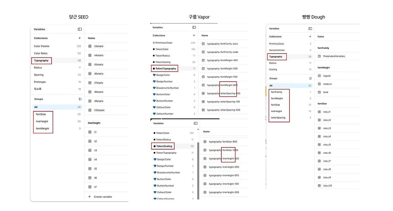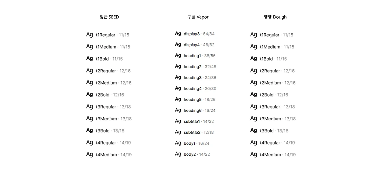 개인적으로는 타이포라는 큰 컬렉션 아래에서 배리어블을 찾는 게 더 편하다고 느껴서 당근의 방식으로 하되, 구름처럼 letterSpacing도 추가하기로 결정