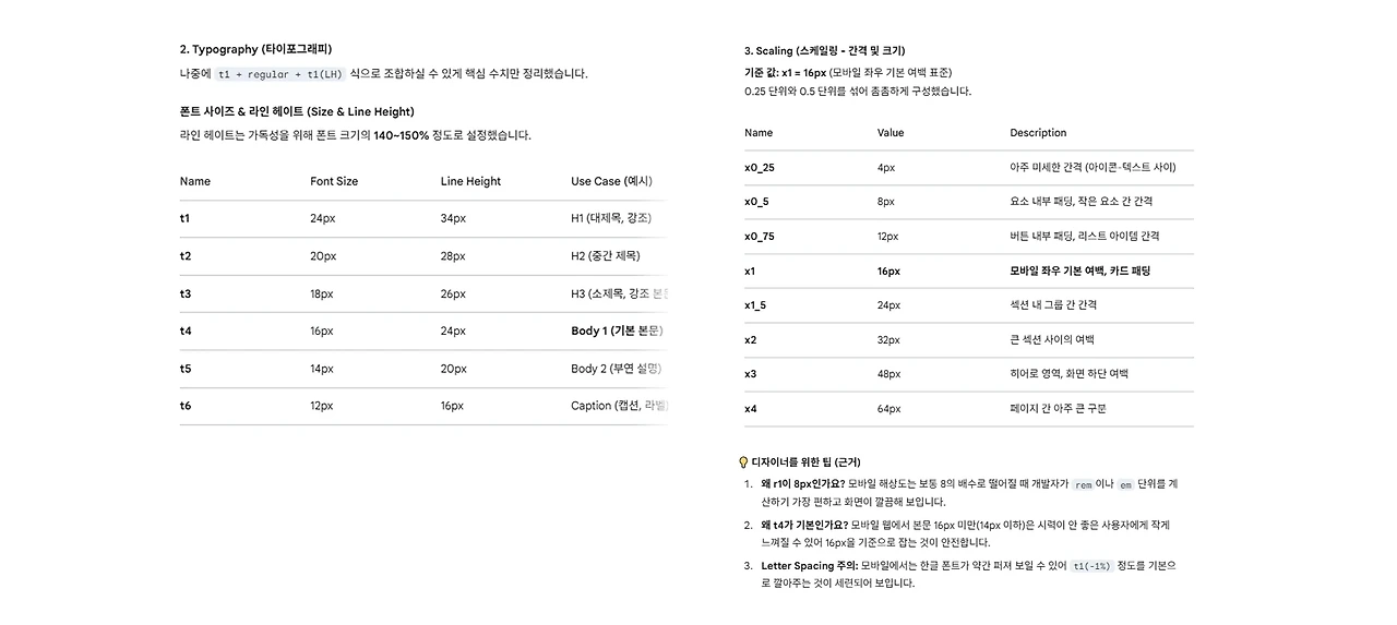 기준(폰트 사이즈, 8배수 등)이 있으면 오히려 초기에 와이어 프레임 제작할 때 값에 대한 고민이 줄어서 더 빠르게 할 수 있을듯