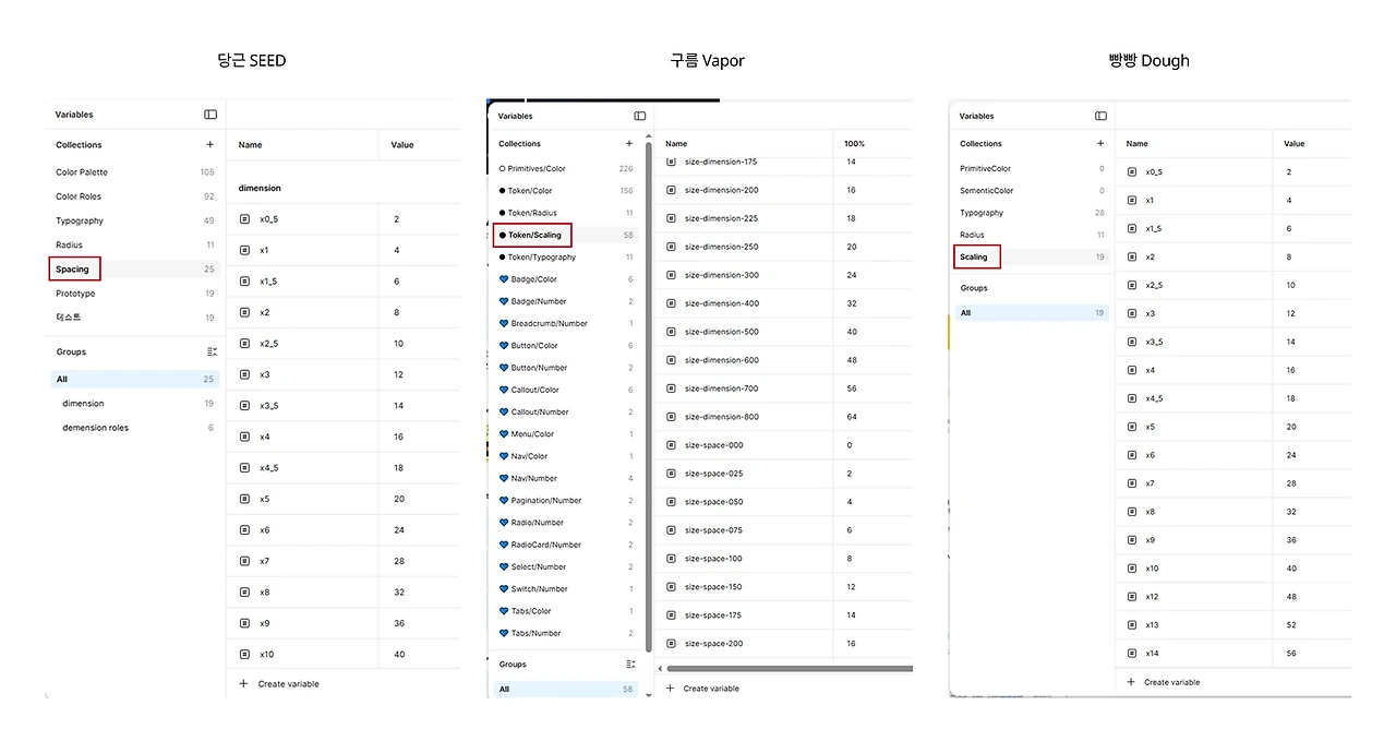 SEED : Spacing 컬렉션 안에 dimension 이라는 그룹으로 모든 간격과 크기들을 같은 배리어블로 통일