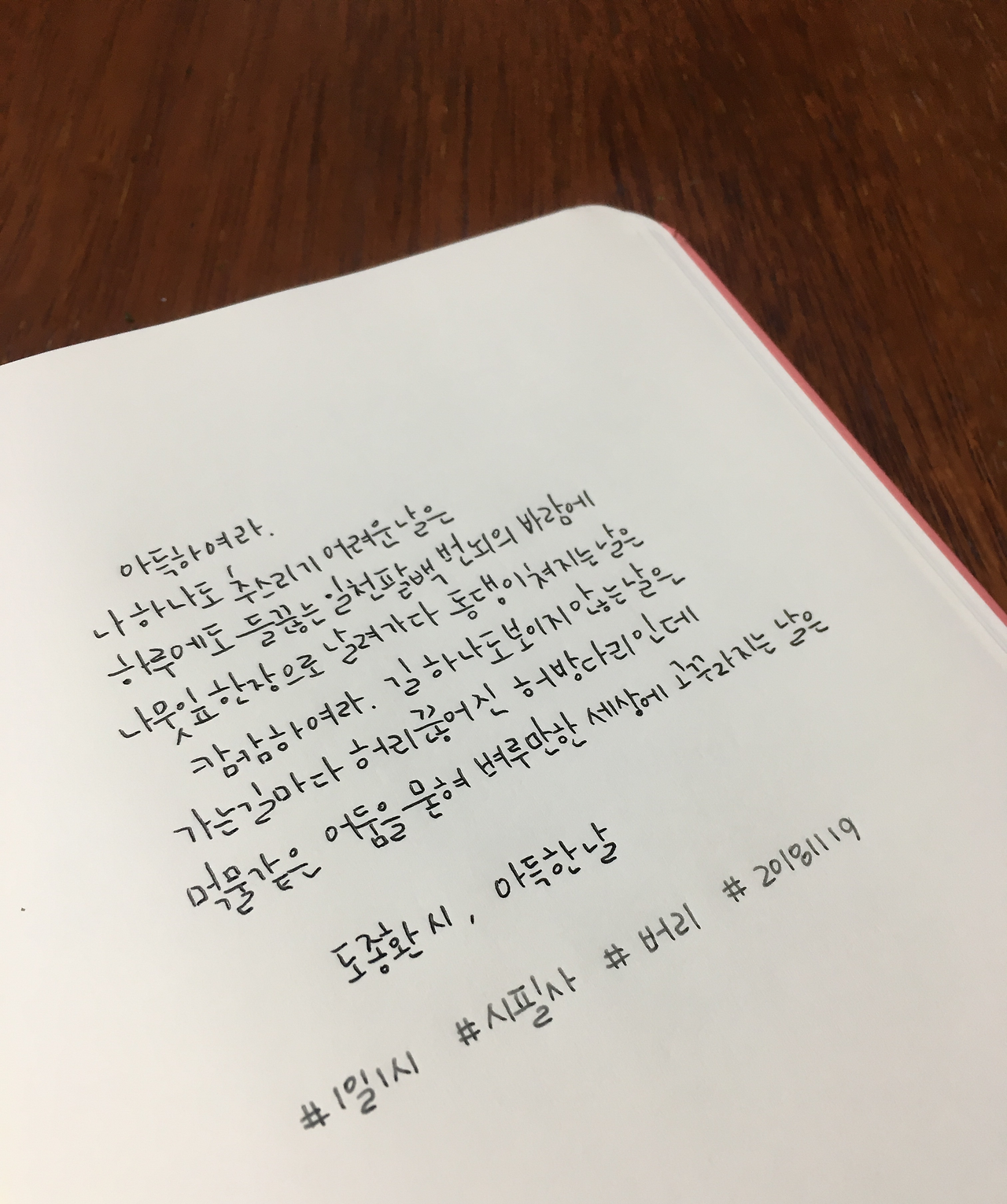 아득한날_도종환 아득하여라. 나 하나도 추스리기 어려운 날은하루에도 들끓는 일천팔백 번뇌의 바람에나뭇잎 한 장으로 날려가다 동댕이쳐지는 날은캄캄하여라. 길 하나도 보이지 않는 날은가는 길마다 허리 끊어진 허방다리인데먹물 같은 어둠을 묻혀 벼루만한 세상에 고꾸라지는 날은