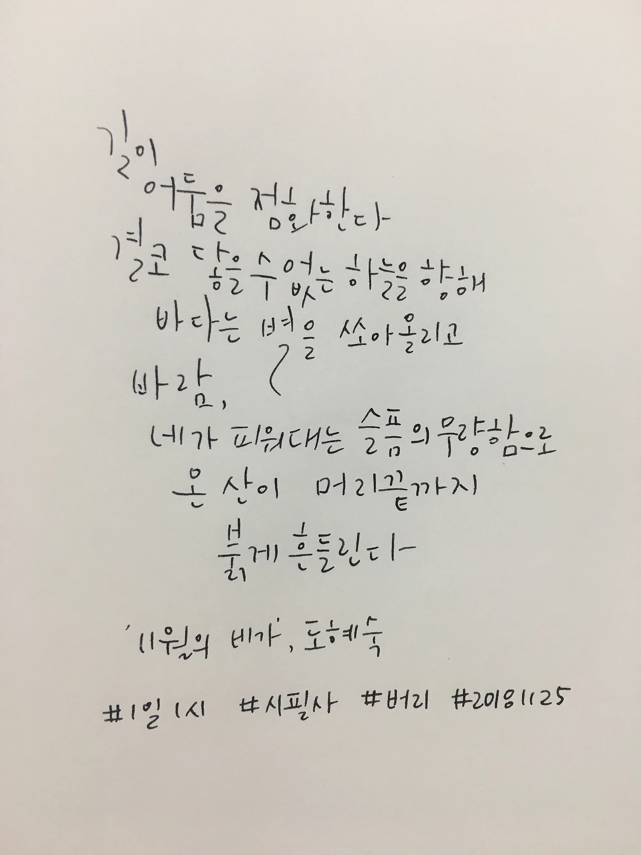 11월의 비가 / 도혜숙 길이 어둠을 점화한다 결코 닿을 수 없는 하늘을 향해 바다는 별을 쏘아 올리고 바람, 네가 피워대는 슬픔의 무량함으로온 산이 머리끝까지 붉게 흔들린다