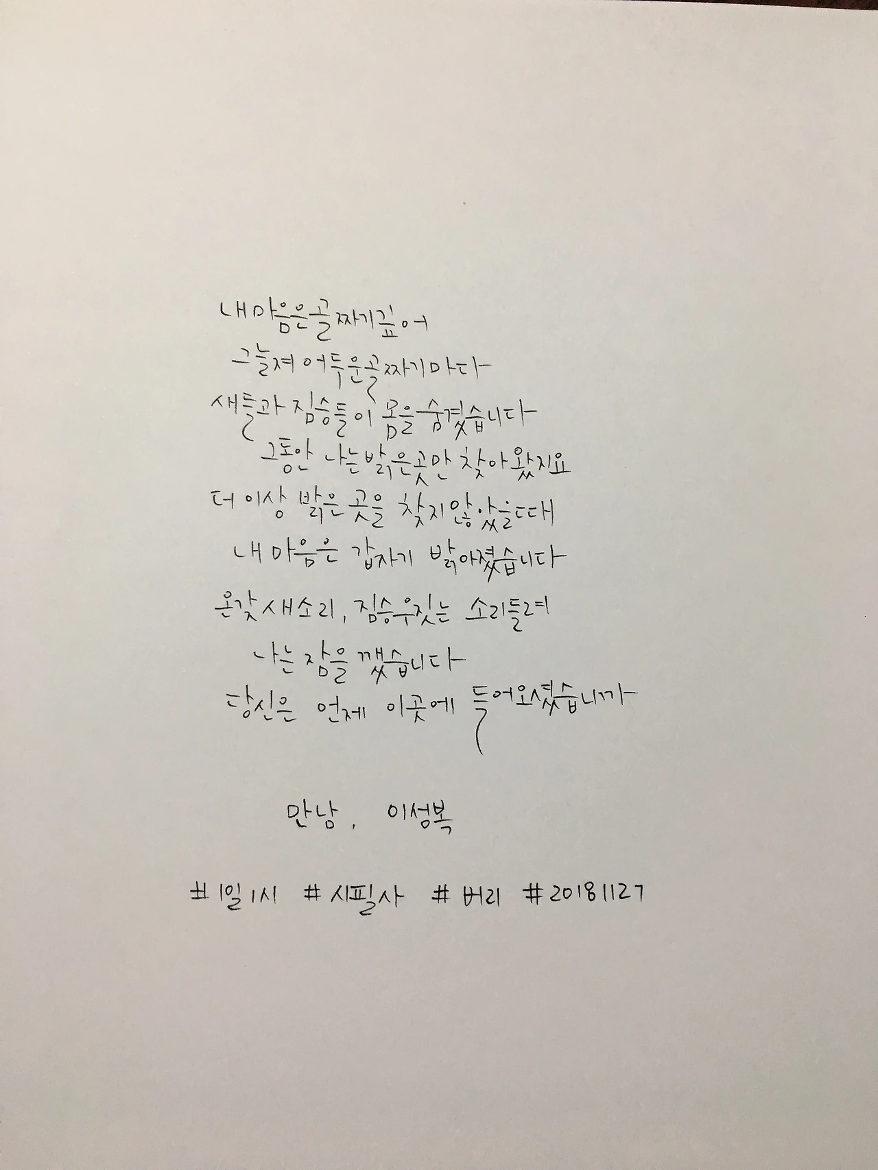 만남_이성복내 마음은 골짜기 깊어 그늘져 어두운 골짜기마다 새들과 짐승들이 몸을 숨겼습니다 그 동안 나는 밝은 곳만 찾아왔지요 더 이상 밝은 곳을 찾지 않았을 때 내 마음은 갑자기 밝아졌습니다 온갖 새소리, 짐승 우짖는 소리 들려 나는 잠을 깼습니다 당신은 언제 이곳에 들어오셨습니까