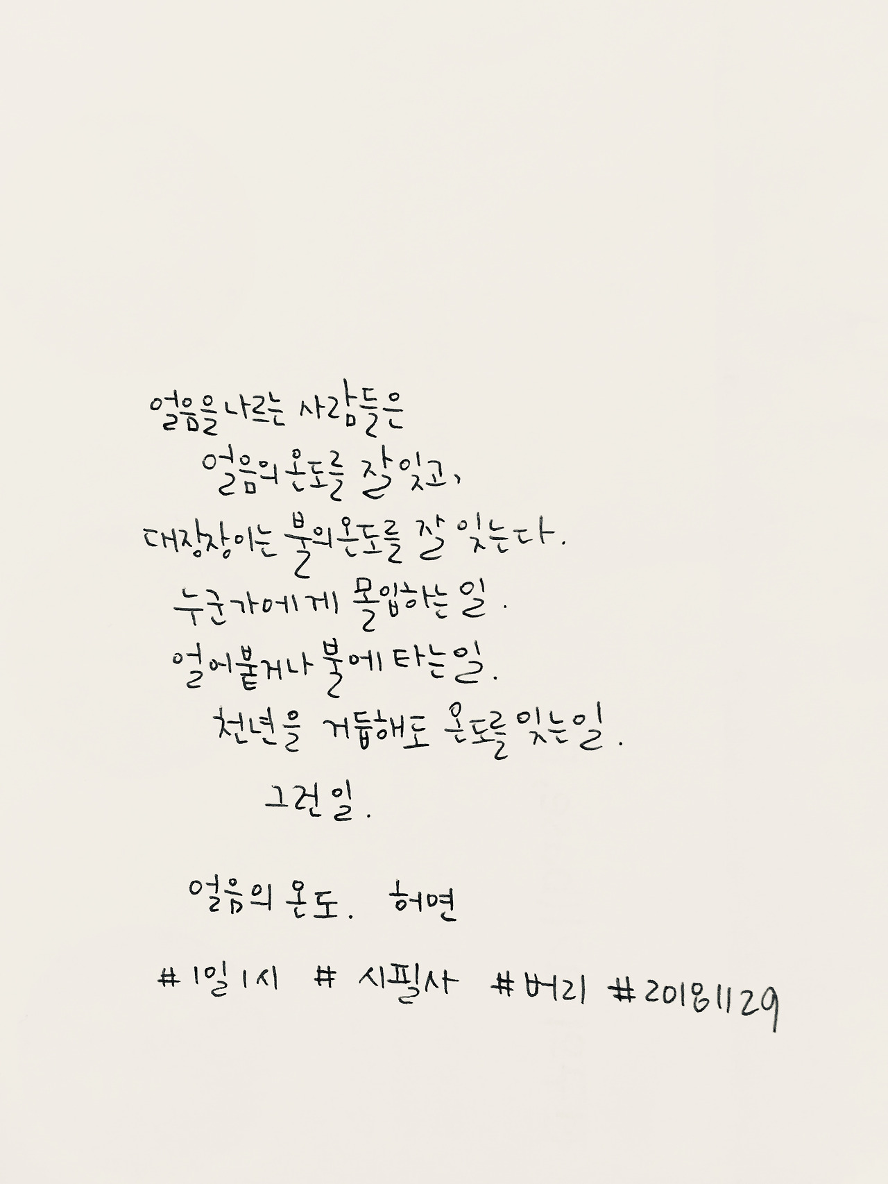 얼음의 온도_허연얼음을 나르는 사람들은 얼음의 온도를 잘 잊고, 대장장이는 불의 온도를 잘 잊는다. 누군가에게 몰입하는 일. 얼어붙거나 불에 타는 일. 천년을 거듭해도 온도를 잊는 일. 그런 일. 허연의 시집 <내가 원하는 천사> 중