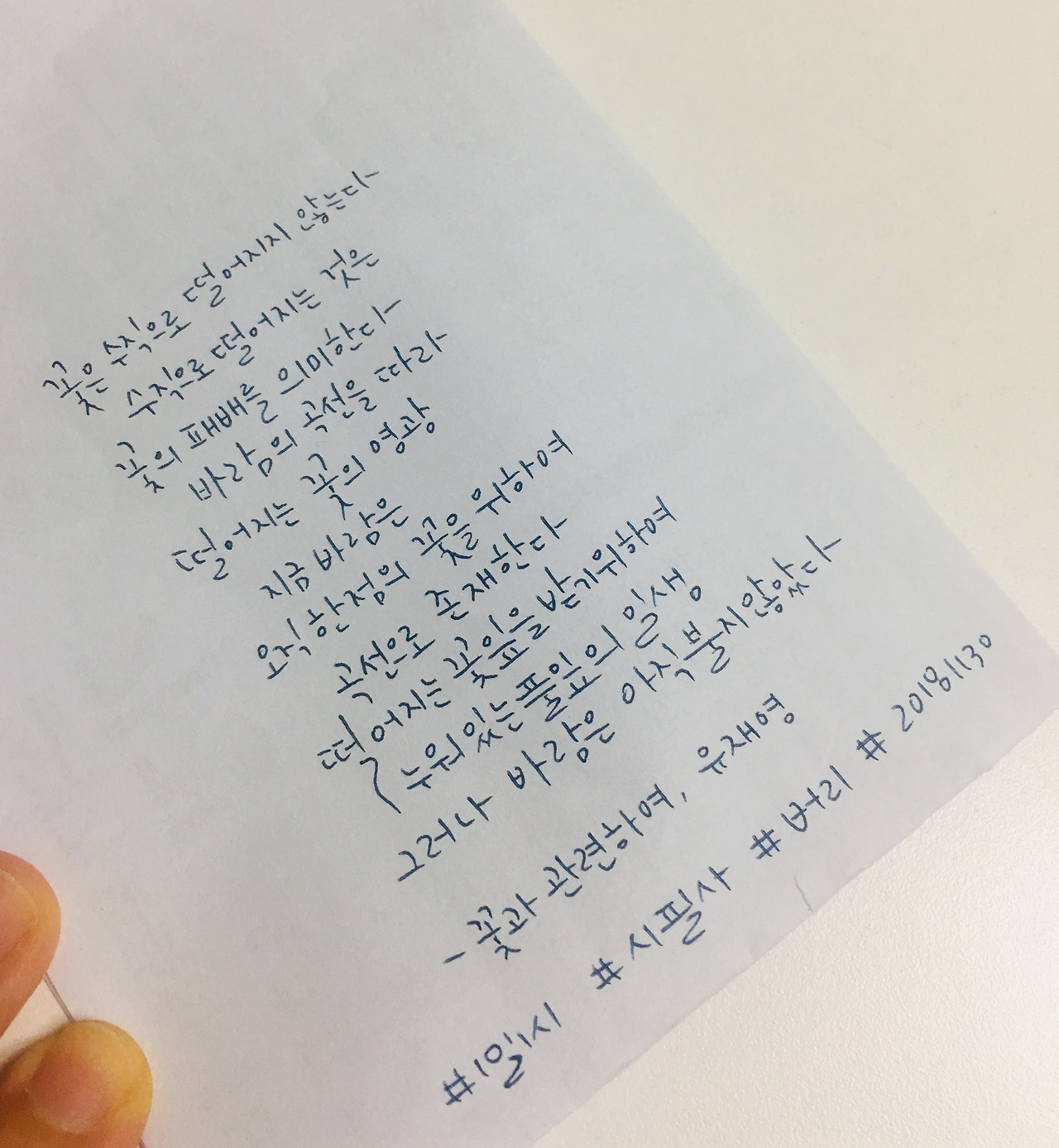 꽃과 관련하여 by 유재영꽃은 수직으로 떨어지지 않는다수직으로 떨어지는 것은꽃의 패배를 의미한다바람의 곡선을 따라떨어지는 꽃의 영광지금 바람은오직 한 점의 꽃을 위하여곡선으로 존재한다떨어지는 꽃잎을 받기 위하여누워 있는 풀잎의 일생그러나 바람은 아직 불지 않았다