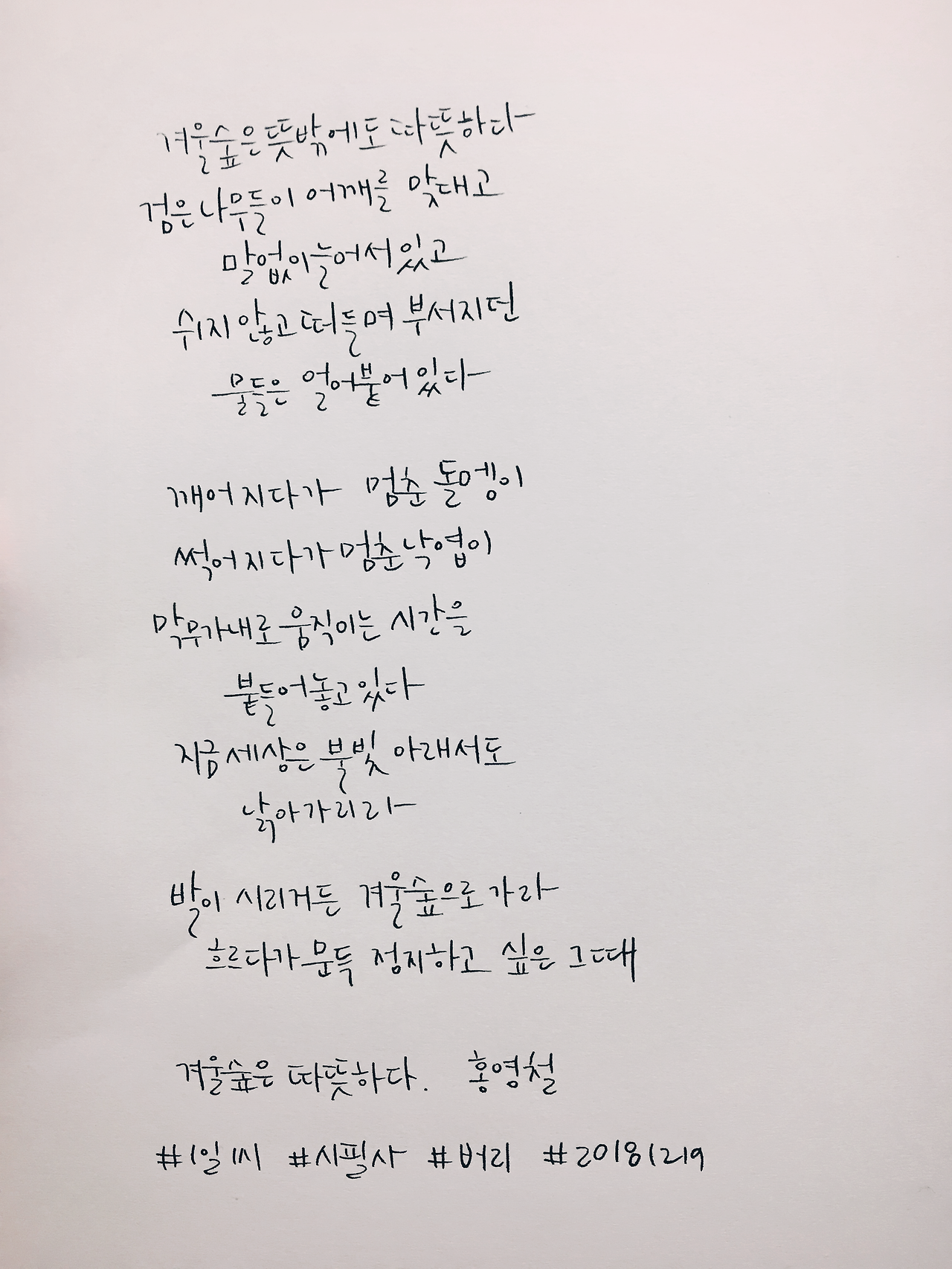 겨울 숲은 따뜻하다 / 홍영철겨울 숲은 뜻밖에도 따뜻하다검은 나무들이 어깨를 맞대고 말없이 늘어서 있고쉬지 않고 떠들며 부서지던 물들은 얼어붙어 있다깨어지다가 멈춘 돌멩이썩어지다가 멈춘 낙엽이막무가내로 움직이는 시간을 붙들어놓고 있다지금 세상은 불빛 아래에서도 낡아가리라발이 시리거든 겨울 숲으로 가라흐르다가 문득 정지하고 싶은 그때