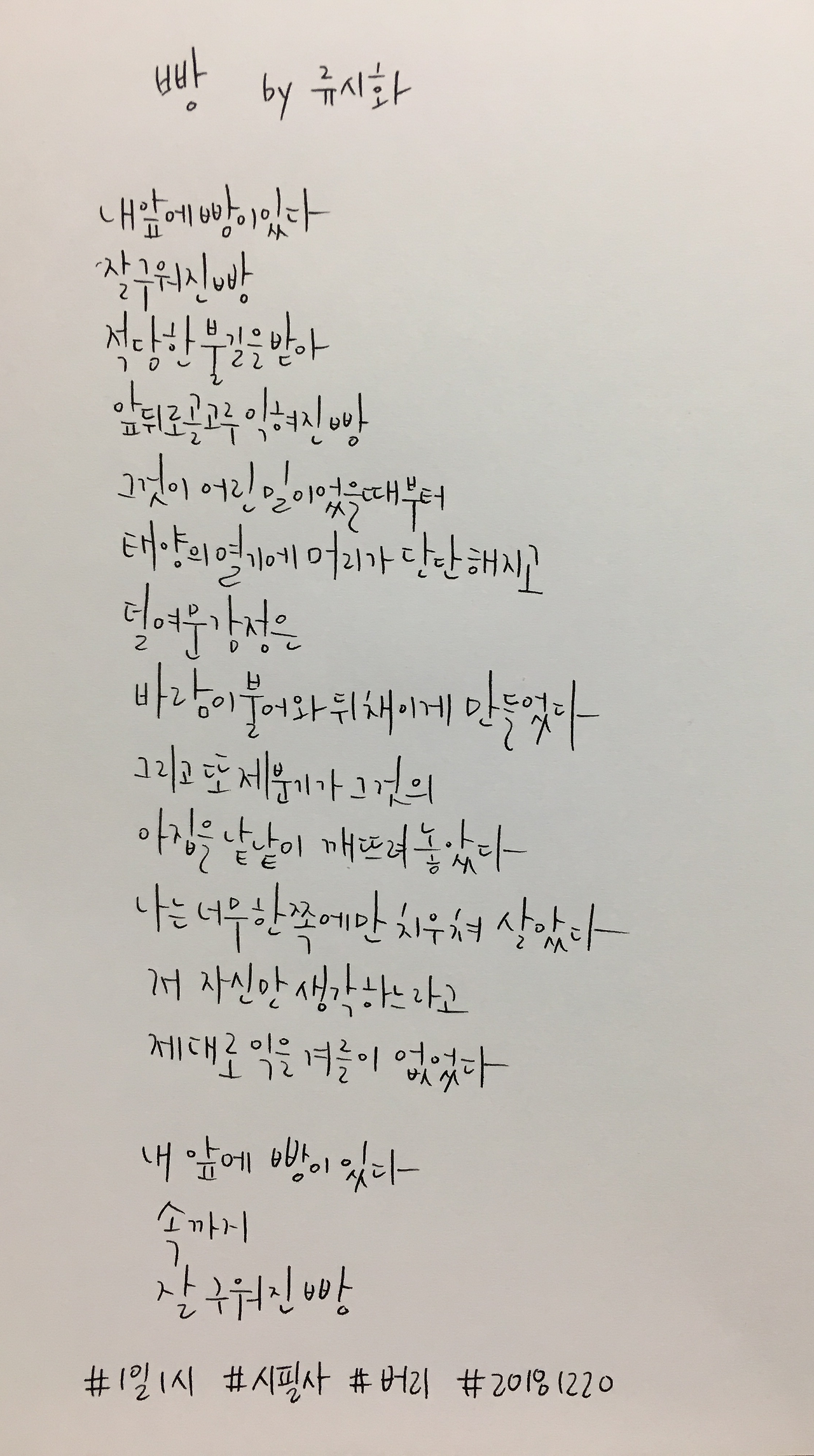 [1220] 빵 by 류시화내 앞에 빵이 하나 있다잘 구워진 빵적당한 불길을 받아앞뒤로 골고루 익혀진 빵그것이 어린 밀이었을 때부터태양의 열기에 머리가 단단해지고덜 여문 감정은바람이 불어와 뒤채이게 만들었다그리고 또 제분기가 그것의아집을 낱낱이 깨뜨려 놓았다나는 너무 한쪽에만 치우쳐 살았다저 자신만 생각하느라고제대로 익을 겨를이 없었다내 앞에 빵이 하나 있다속까지잘 구워진 빵
