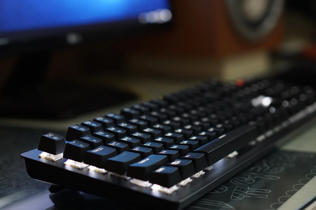넓은 책상, 기계식 키보드, 모니터, 의자, 소형 스피커, 그래픽카드