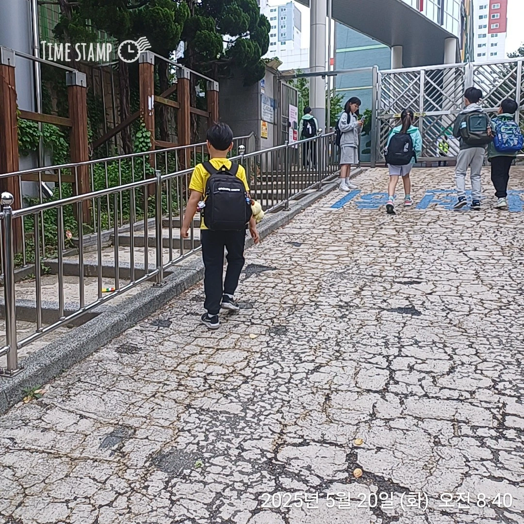 등굣길 친구들이 반별로 색깔이 다른 알록달록 반티셔츠를 입었네.
