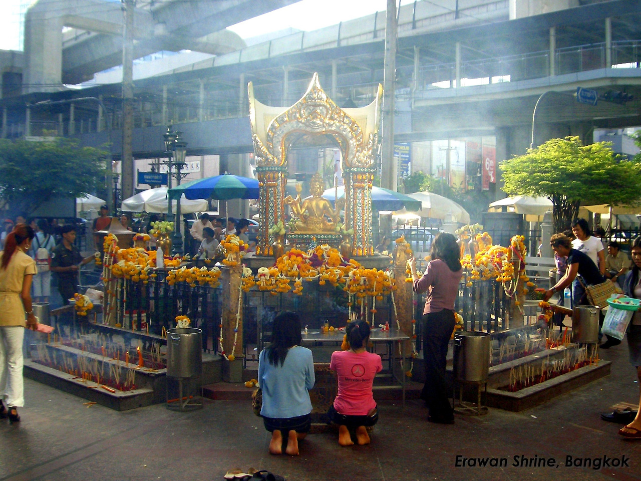 방콕의 도심 한가운데 위치한 에라완 신전은 많은 관광객들이 찾는 관광명소이자 영험한 곳으로 알려져 있다. 1956년 세워진 에라완 신전은 외국 손님의 숙박을 위한 국영 호텔 (지금의 그랜드 하이얏트 에라완 호텔)을 건설하는 과정에서 잇따른 사고가 발생하자 건설 책임자인 파오 경찰대장이 당대 유명한 점술가에게 개장일을 의뢰하였는데, 이 점술가는 호텔 부근의 일대가 인간들이 범해서는 안되는 신들의 구역이라며 신을 위한 제단을 지어야만 한다고 조언했다. 이렇게해서 만들어진 에라완 신전 덕에 랏차쁘라쏭 일대는 방콕 최대 번화가로 발전하였고 하루에도 수천 명이 찾는 관광명소가 되었다.