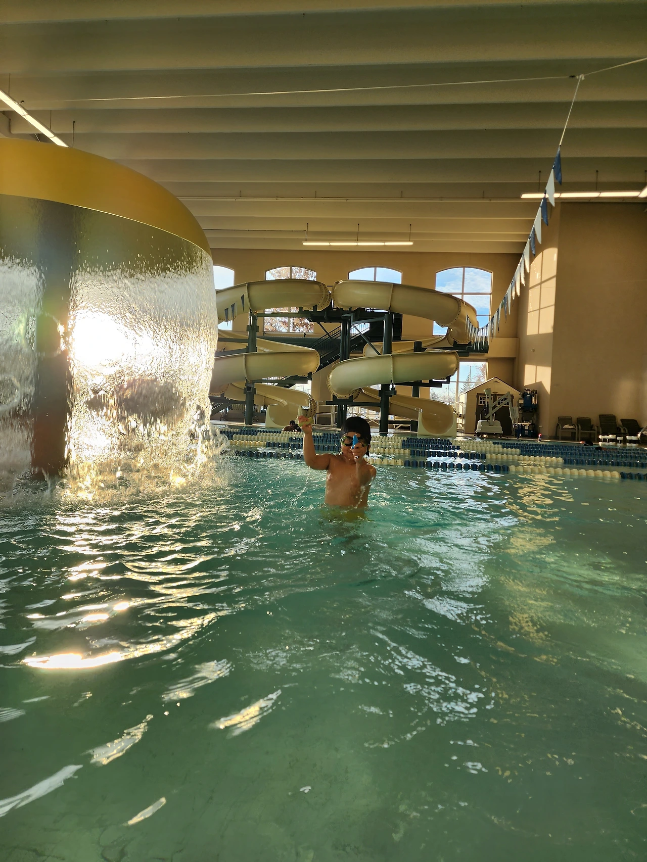 수영장에 물과 함께 아이에게 쏟아지는