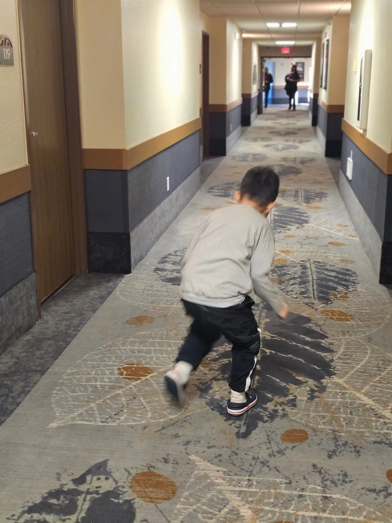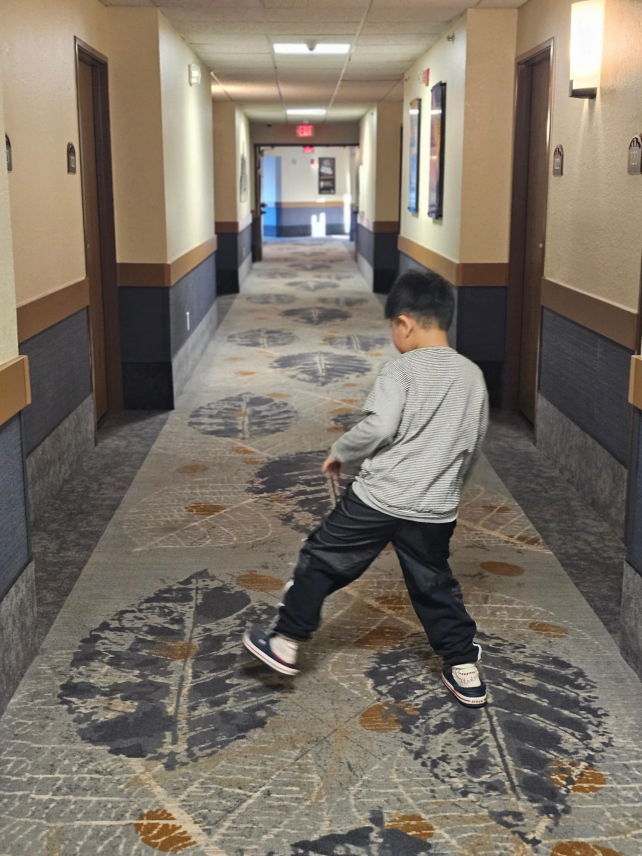 리조트 복도의 카펫에 나뭇잎 모양이 규칙적으로