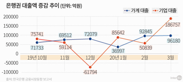 한국이라고 다를까. 미국에 비해 의료 복지 시스템이 안정적으로 운영되고 코로나 확산세도 미국보다 빠르게 잦아들고 있다. 하지만, 직장 폐쇄나 사회적 거리두기가 여전히 이어지는 상황에 영세 자영업자와 중소기업, 스타트업 등을 중심으로 줄폐업·도산의 위험이 높아진다. 8일 한국은행이 발표한 '3월 중 금융시장 동향' 자료에 따르면 지난달 은행권의 가계 대출과 기업 대출의 증가 폭이 통계 집계 이후 모두 최대치를 나타냈다. 빚을 내 버티는 형국이 펼쳐진 것이다.