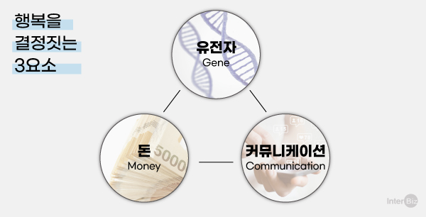 과학자들은 행복의 요소로 유전자, 경제력, 커뮤니케이션을 꼽는다. 이 세 가지 변수는 속성이 다르고 변수 간 상호작용도 다양하기에 이에 대한 이해가 먼저 필요하다.