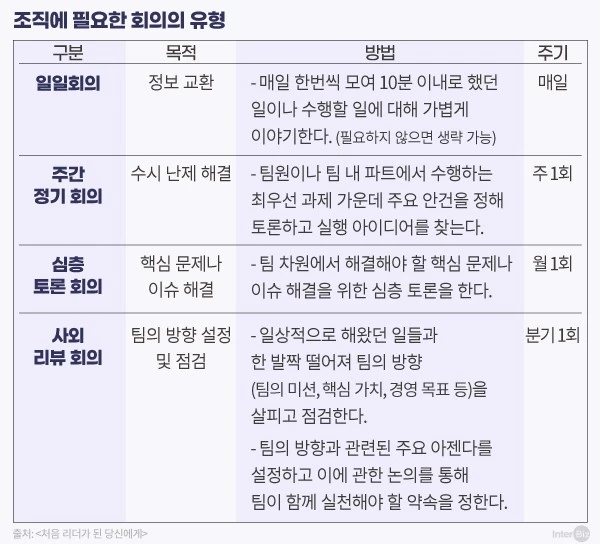 아래 표는 조직에서 일반적으로 많이 관찰되는 회의 유형과 목적·방법을 정리한 것이다. 이를 기반으로 팀의 특성이나 처한 상황에 따라 유형, 목적, 방법, 주기 등을 달리해 운영하면 된다.