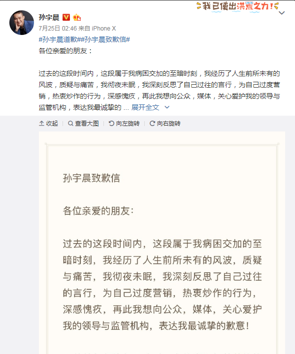 이후 7월 23일, 선은 자신의 웨이보(Weibo, 중국의 SNS)에 공식 사과문을 올렸다. 자신의 이기적이고 미성숙한 언행에 대해 사과했고, 자신의 노력이 기대하지 못한 결과를 낳은 ‘실패한 마케팅’이라고 평가했다. 선은 덧붙여, 앞으로 한동안은 SNS나 인터뷰를 줄이고 블록체인 기술 개발에 주력하겠다고 말했다. 다음날 트론의 주가는 15% 급락했다. 모든 암호화폐 기업의 주가가 낮아진 시기이긴 했지만, 하락세가 두 자릿수를 기록한 건 트론뿐이었다.