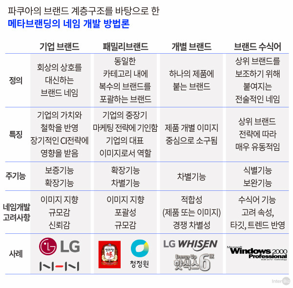 기업 브랜드는 가장 수명이 긴 상위 브랜드 이름으로 기업의 가치와 철학을 근간으로 개발된다. 하위 브랜드를 아울러야 하고 쉽게 교체할 수 없기 때문에 신중하게 개발돼야 한다. 패밀리 브랜드는 다양하고 긍정적인 연상을 할 수 있는 키워드들을 선별해서 향후에 출시될 수도 있는 다양한 제품들 간의 연관성을 확보해야 한다. 대표적으로는 특정 제품에 국한되지 않는 ‘정관장’과 대상의 ‘청정원’, CJ의 ‘백설’ 등이 있다.