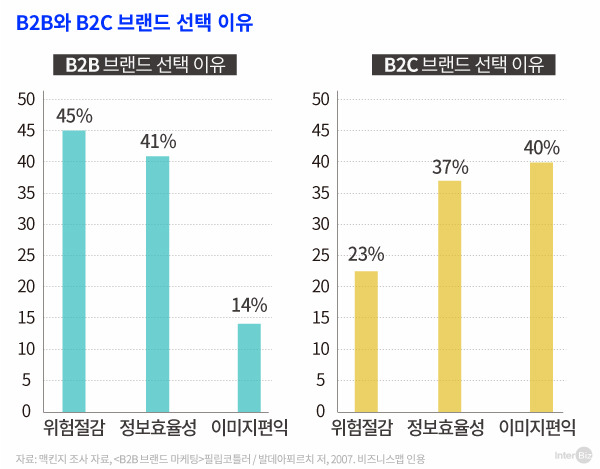 브랜드 이름을 개발할 때, 반드시 고려해야 하는 건 '공략 시장'이다. B2B 시장과 B2C 시장은 기본적으로 타깃이 다르고 고객들의 브랜드에 대한 니즈도 다르다. 컨설팅 회사 맥킨지가 B2B와 B2C 브랜드 선택 이유를 조사한 결과, B2B는 이성적인 측면에서 위험절감 등 기업 안정성이 더 중요하게 나타난 반면 B2C는 감성적인 측면의 이미지 편익 등이 더 중요한 것으로 나타났다.