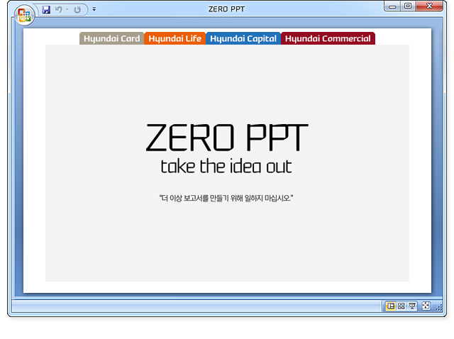 '제로 PPT'를 표방하는 국내 굴지의 대기업은 비단 현대차그룹뿐만이 아니다. 제로 PPT의 첫 스타트를 끊었던 국내 기업은 현대카드였다. 지난 2014년 현대카드는 정태영 부회장의 지시 아래 '제로 PPT 캠페인'을 한달간 시행했다. 이는 외형보다 본질에 집중하자는 정 부회장의 신념이 담긴 캠페인으로 한 달간 부서별로 돌아가며 사내 PPT 사용을 금지했다.
