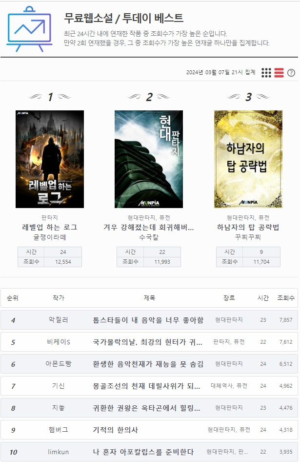 자, 이게 문피아의 투데이 베스트, 일명 '투베'다.