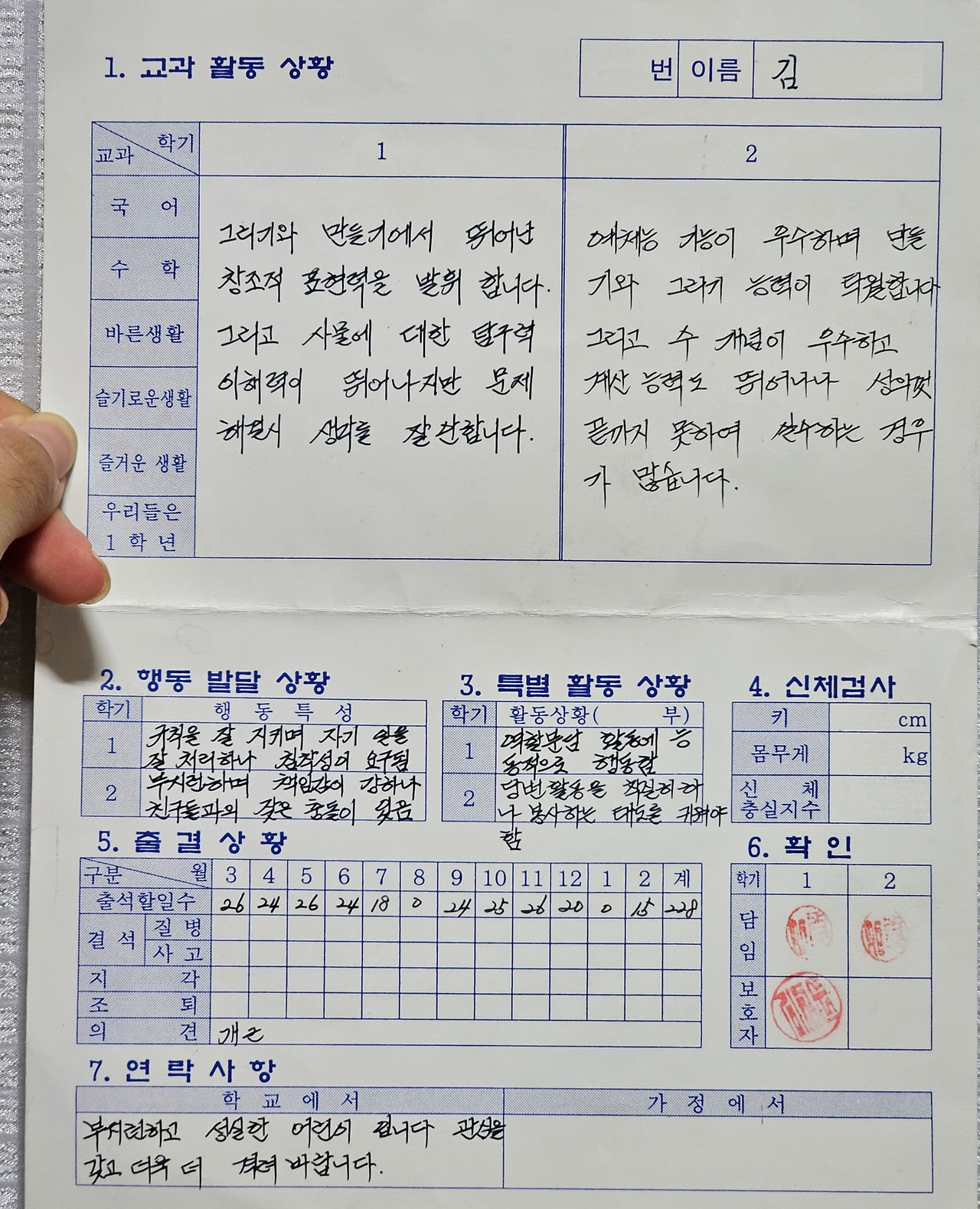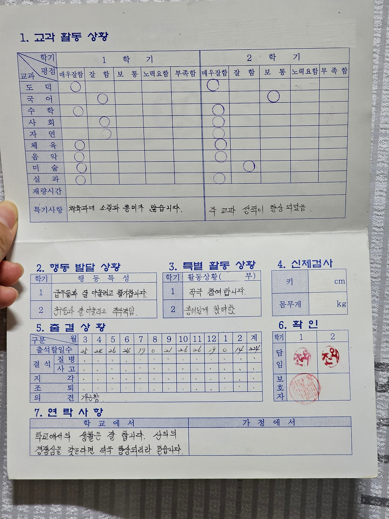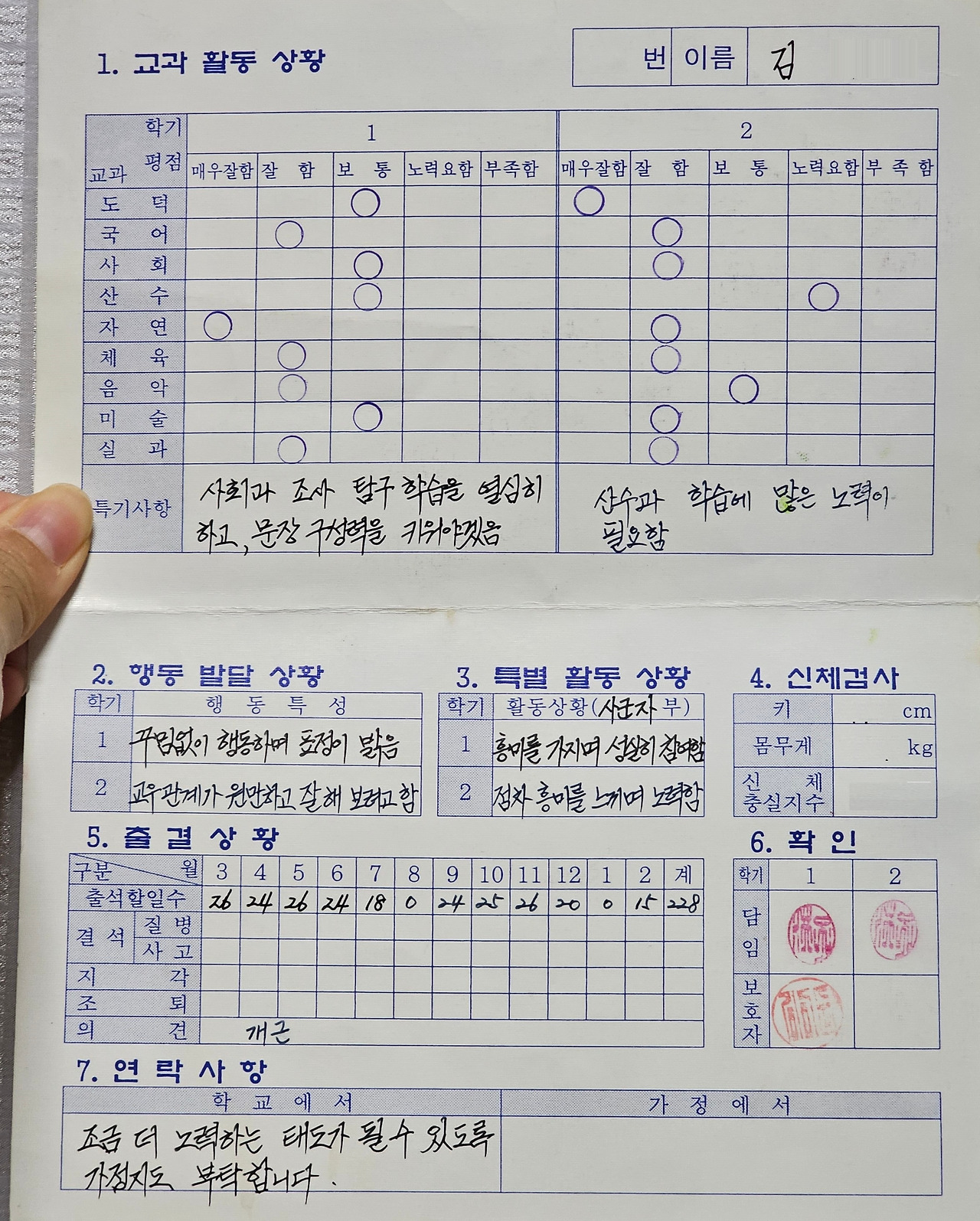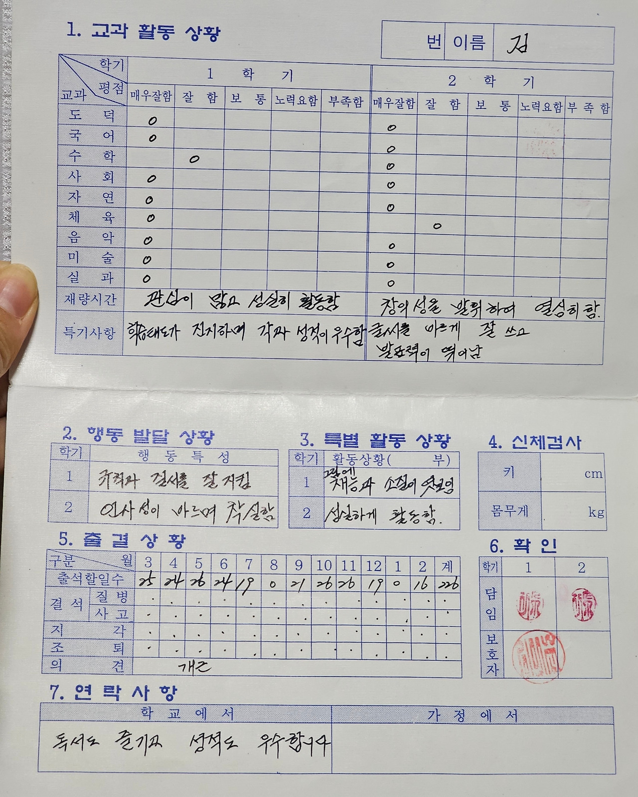 옷장을 분해 하기전, 딸려있는 서랍 안을 열어봤다. 20년 만에 열어봤다. 서랍 4칸 가득 오래돼서 잉크가 날아가버린 영수증과 옷을 사면 하나씩 딸려오는 여분의 단추들, 그리고 오-래 잠들어있던 나의 성적표들이 수북하게 쌓여있었다. 그렇게 나는 20년 만에 어린 시절을 마주했다. 항상 난 어릴 때 어떤 아이였을까 궁금했는데 20년도 더 지난 오래된 생활통지표가 어린 시절의 나를 기록해 두었다. 문득 궁금해졌다. 버리지 않고 보관하고 있던 건 엄마의 귀찮음이었을까 아님 딸의 어린 시절을 영원히 잊고 싶지 않은 미련 때문일까. 어쨌거나 어린이 김분주와 곧 마흔을 바라보는 어른 김분주는 여전히 같은 사람일까 궁금하다.