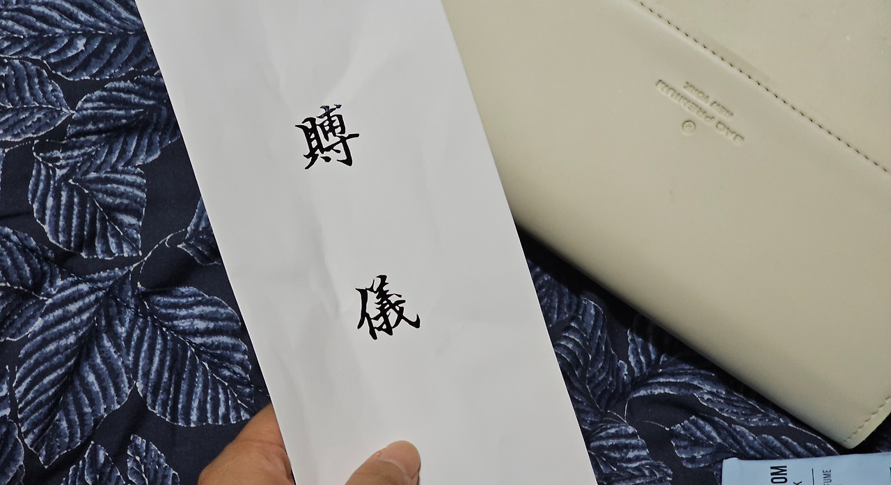 이른 새벽부터 분주하게 챙기다 보니 정신이 없었다. 빳빳한 새 지폐로 축의금을 준비했는데 지갑에 넣어가면 구겨질 것 같아 집에 대충 한자로 뭐가 적힌 새 봉투가 있길래 이름을 적어 돈을 넣었다. 뭔지는 모르지만 '결혼'이라 적혀있는 느낌이 왔다. 새벽이라 주무시는 부모님을 깨워 물어볼 수도 없어 그냥 챙겨 나왔다.