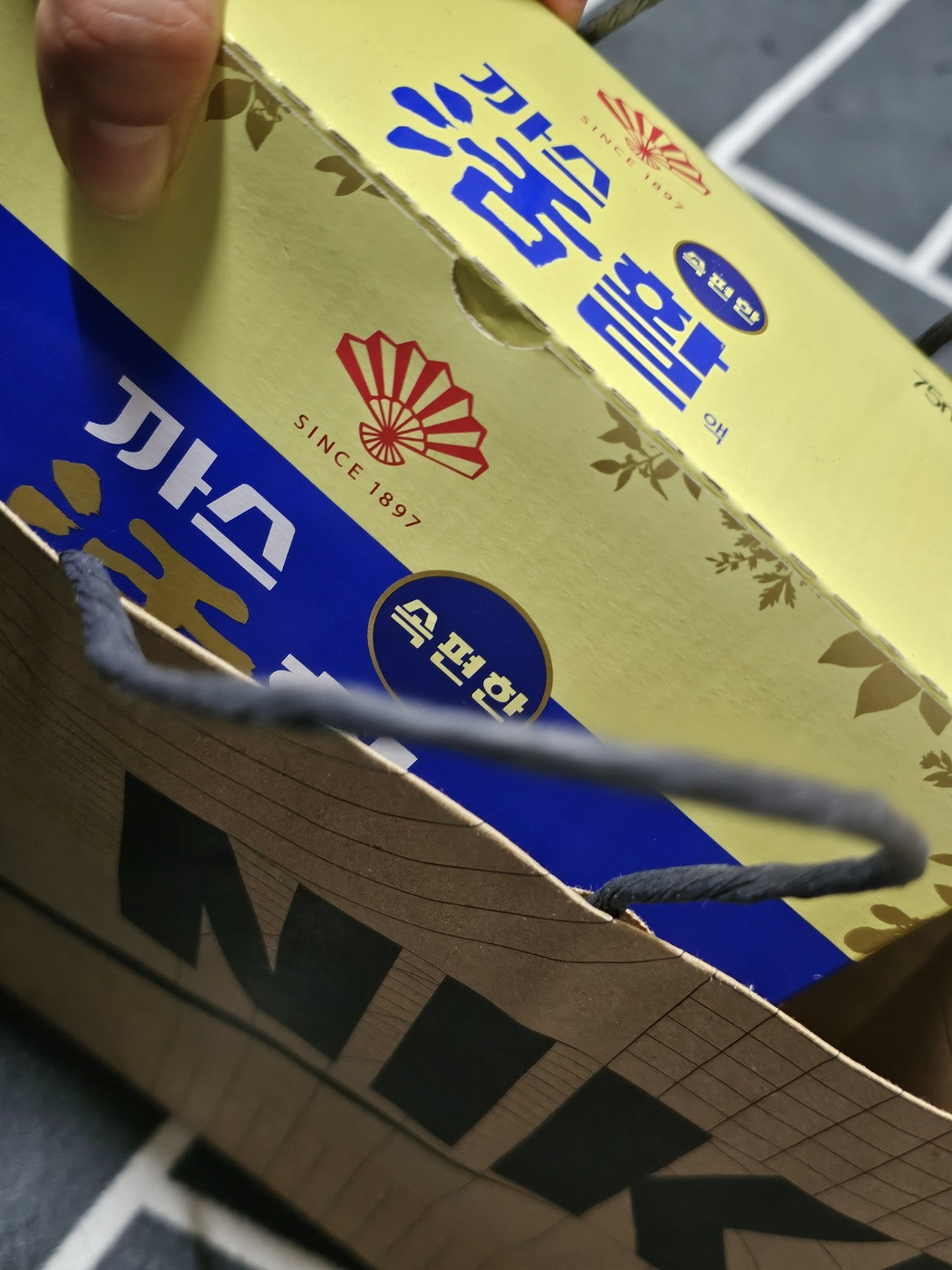 무게가 꽤 나가는 나이키 가방을 손에 받아 든 순간, 묵직한 직육면체 박스감을 느낀 아빠는 나이키 신발인줄 알고 갬동의 눈물을 한 바가지 흘릴 뻔했는데 부채표 모양을 보는 순간 민들레 홀씨 날리듯 날아가버린 아빠의 눙무ㄹ...