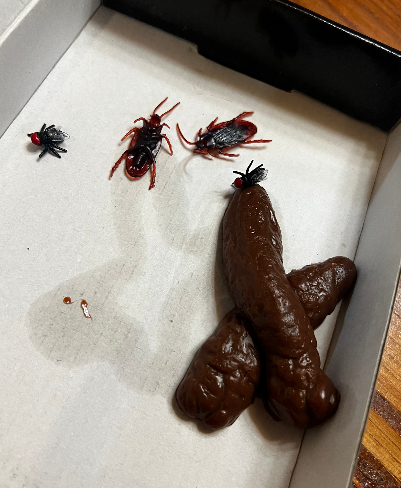 그가 천천히 포장지를 뜯고 종이 박스 뚜껑을 조심스럽게 살짝 열었다. 그리고 곧이어 그는 기겁을 하고 고함을 질렀다.