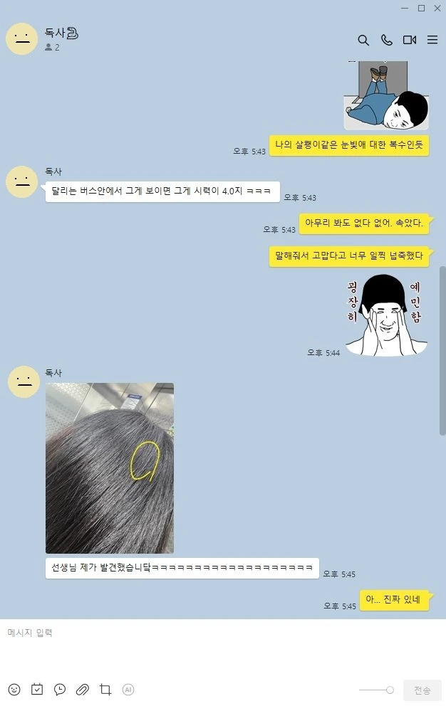 "아가씨 뒷통수에 흰머리가 한가닥 있어.