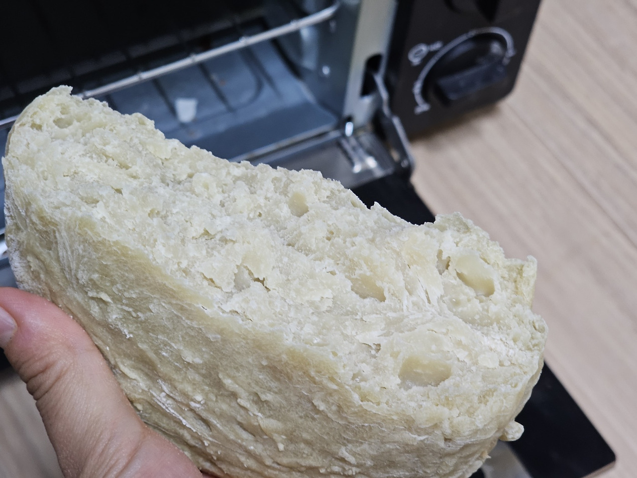3인 가족이 먹을 양으로 유튜버가 알려준 레시피의 2배 분량의 재료를 준비해 밀폐용기에 모두 때려 넣고 이리저리 치댄 다음 1시간 발효시켜 두었다. 설레는 마음으로 1시간 뒤, 뚜껑을 열었는데 유튜버가 만든 것과는 다른 느낌이었다. 구멍 송송, 봉긋하게 부풀어 올라야 하는데 반죽은 찹쌀처럼 퍼져서 밀폐용기 바닥에 진뜩하게 달라붙어있었다. '이게 맞나?' 동서남북으로 치대라고 하던 유튜버의 말을 믿고 반죽을 들어 올리니 쫀득쫀득하게 늘어졌다. 이렇게... 되는 게 맞겠지? 의심은 들었지만, 일단 30분을 더 발효해 두기로 했다. 그리고 다시 꺼내서 반죽을 치대 봤다. 그런데 30분 전에 비해 달라진 건 전혀 없었다. 이거 정말 괜찮은 걸까, 패닉에 빠졌지만 그래도 계속 과정을 따라가며 구워보기로 했다. 첫술에 배부를 수 없지 고롬고롬. 하지만 시간이 지날수록 점점 더 모양이 괴기스러워졌다.