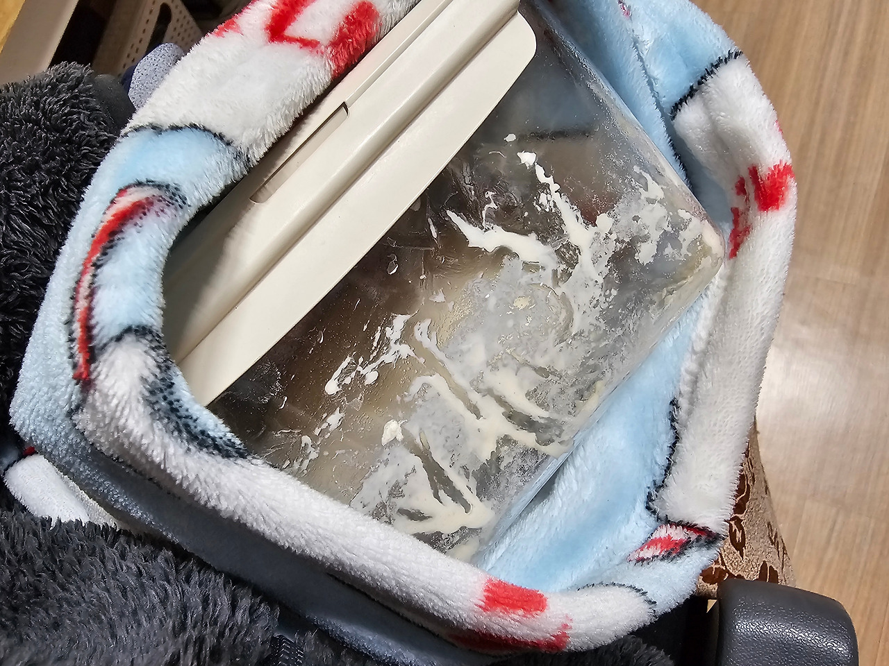 하지만 30분 발효뒤. 달라진게 크게 없는것 같은 쎄함이 느껴졌다. 블로그를 통해 본 다른 사람들과의 빵과는 확실히 다르다. 그래도 지난날보다는 달리 이번에는 먹을수는 있을것 같았다. 나름 조금은 부풀어 올랐으니, 반은 성공했다 스스로를 위로했다. 마지막 30분 발효때는, 빠른 발효를 위해 온도를 조금 높여야 겠다고 생각해서 나의 온기를 전달하고자 담요로 감쌌다.