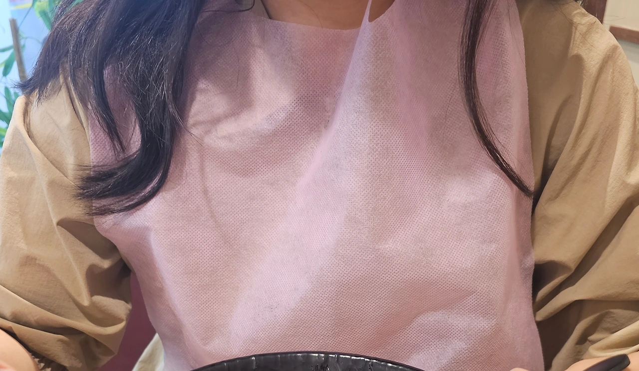 한참을 찍고 나서야 우리는 카메라를 내려놓고 밥을 먹기 시작한다. 몇 번 체험단을 하다 보니 이제는 요령도 생겨서, 처음에만 열심히 찍고 나면 그다음은 편하게 즐긴다. 이상하게도 이날 따라, H가 앞치마를 한 내 상반신 사진이 필요하다고 해서 식당에서 제공해주는 앞치마를 마지못해 착용했다. 나는 평소에 음식을 먹을 때 흘리거나 옷에 묻히는 스타일이 아니라 앞치마를 잘 안 하는 편인데 블로그에 필요하다고 하니 울며 겨자먹기로 입었다. 사실상 앞치마라기보단 거의 턱받이에 가까워서 그걸 입은 모습이 내 모습이 너무 웃겨서 한참을 깔깔댔다. H와 마주 앉아 맛있게 식사하며 수다를 떨고 있는데, 누군가 우리 테이블 옆에 다가와 반가운 목소리로 내 이름을 불렀다.