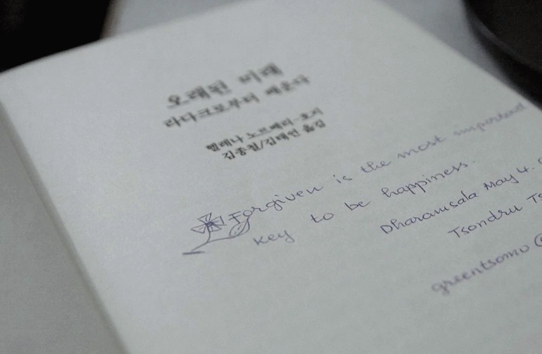 나는 정말 행복한 것일까. 그녀는 누구에게 용서받기 위해 이 힘든 수행을 하고 있는 것일까. 그가 써준 글을 몇 번씩 곱씹고 있는데 그가 갑자기 책을 다시 가져갔다. 그에게 다시 받아 든 책의 글귀 위에는 예쁜 꽃 그림이 새로이 하나 그려져 있었다.
