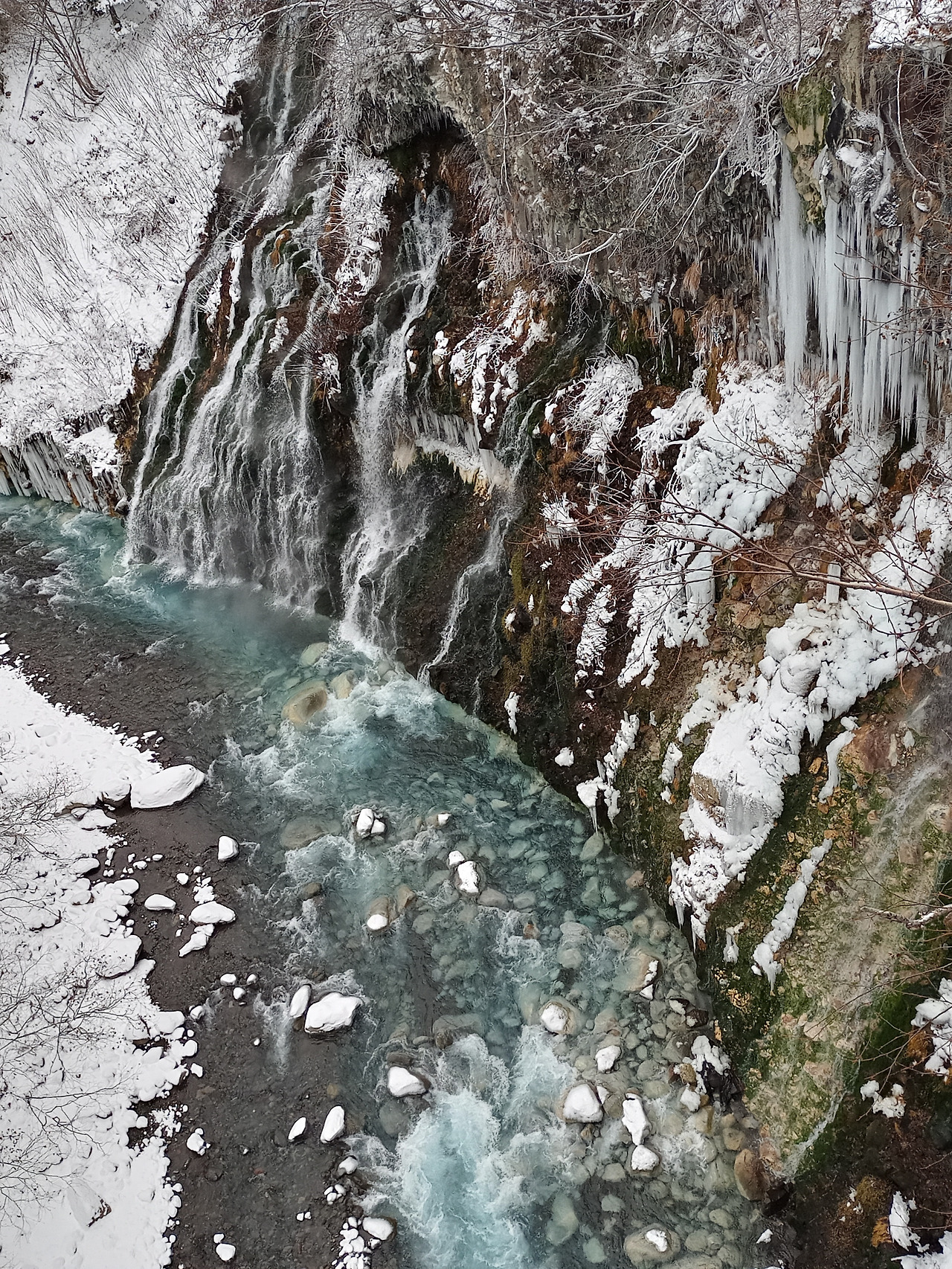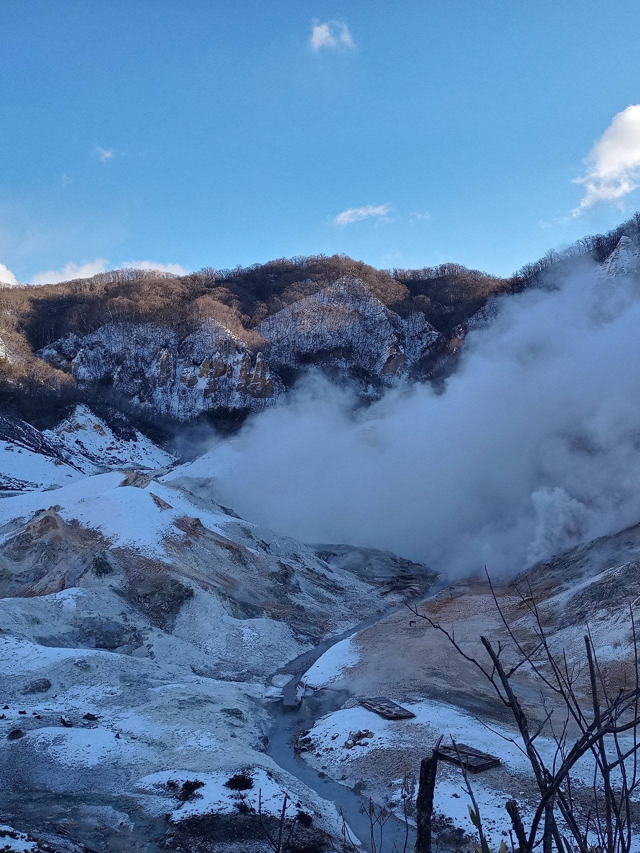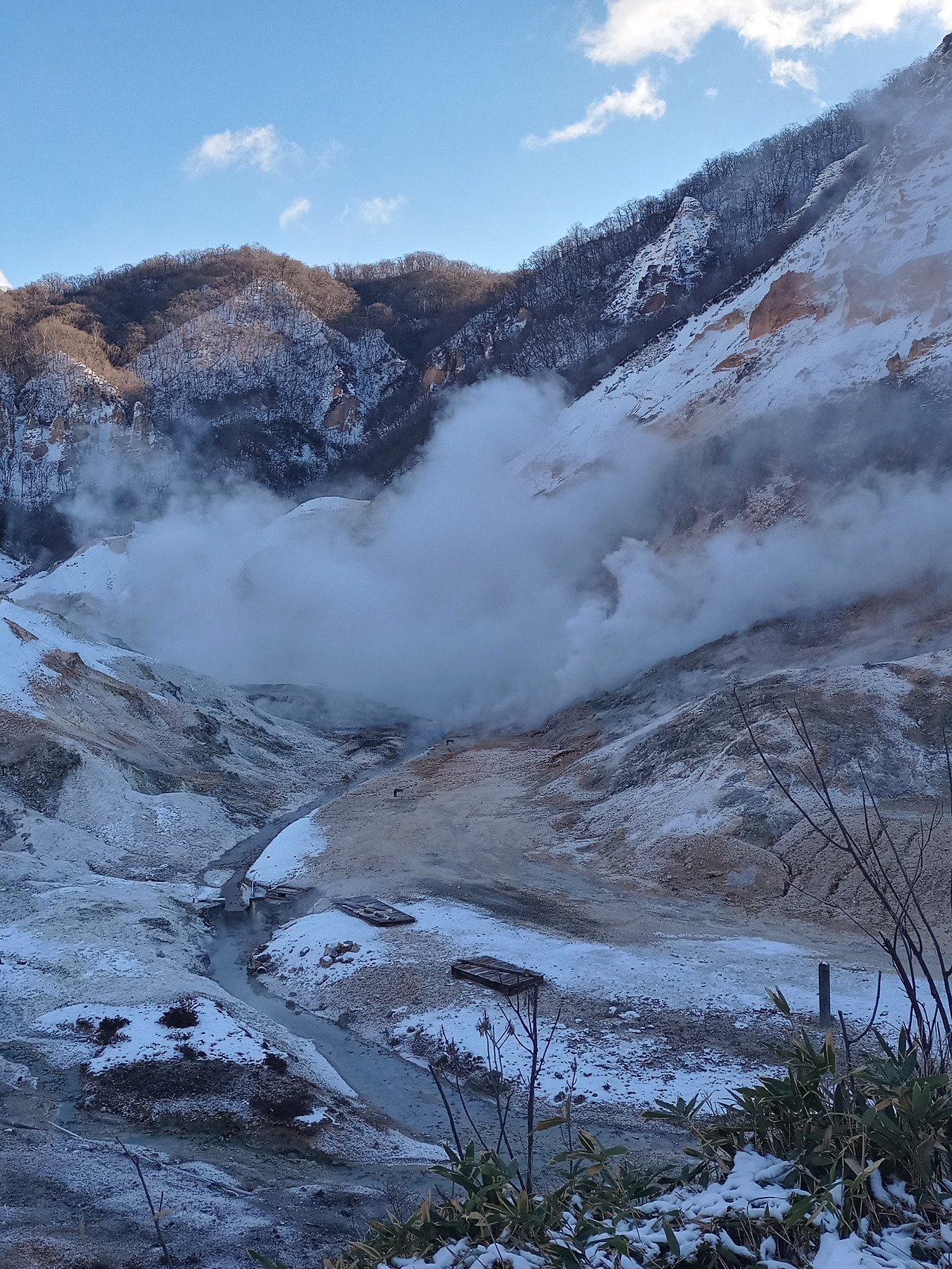 산마루에서 올라온 산길을 등지고 바라보니 시야가 탁 트이는 넓은 분지가 발아래 펼쳐지고 굽이 친 봉우리들이 그 분지를 둘러싸는 형태로 연이어져 있었다. 멀리 있는 봉우리에서도 김이 올라오고 있었지만 발아래 바위로 뒤덮인 분지에서 솟아오르는 김은 보면서도 믿기지 않는 광경이었다. 험한 바위로 뒤덮인 분지, 여기저기 녹지 않은 채 그대로인 하얀 눈, 그 사이에서 기세 좋게 피어오르는 연기, 자연이 주는 공포가 실감되었다. 지옥계곡은 더할 나위 없는 이름임에 분명했다.