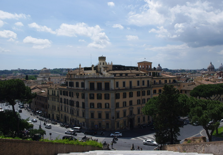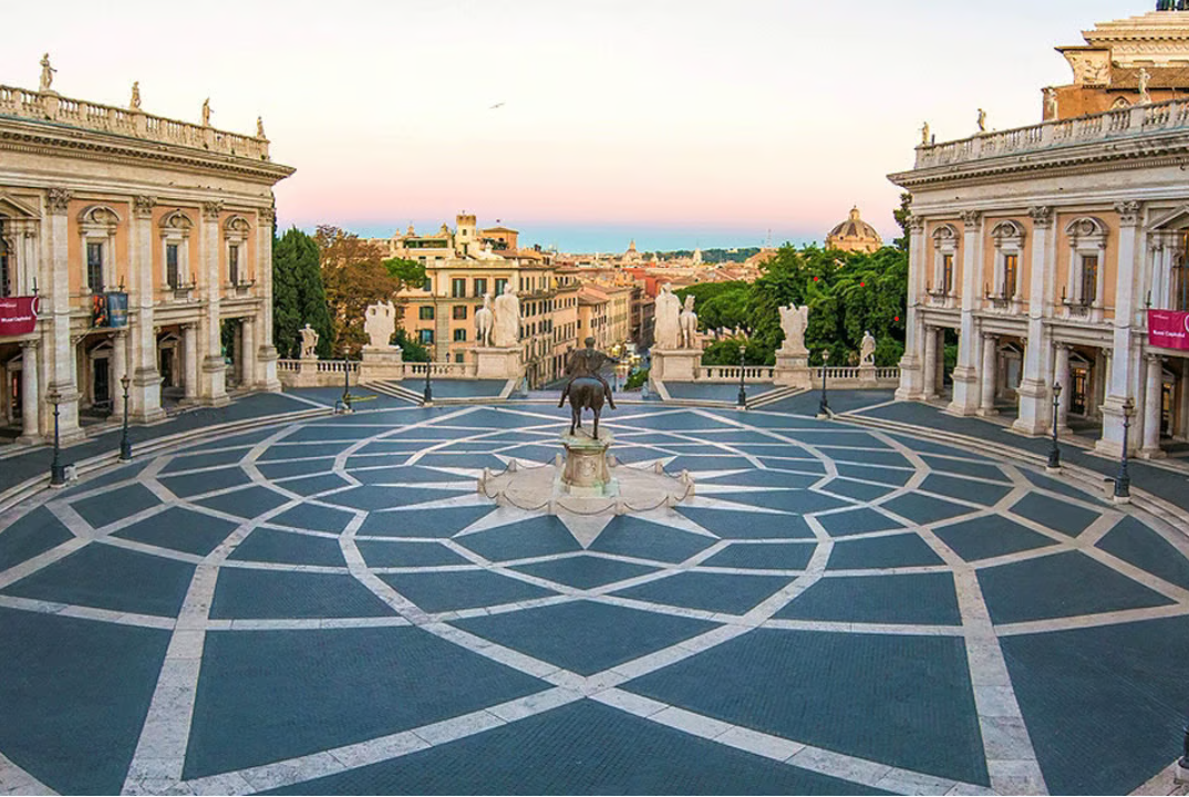 캄피톨리오 광장으로 오르는 계단이 미켈란젤로의 작품인데요, 돌계단이 있는 언덕길이라는 뜻의 ‘코르도나타’라고 불립니다. 그러나 미켈란젤로는 공사 초기에 사망하고 맙니다. 하지만 그의 사후에도 그의 설계대로 공사가 계속 진행되어 1세기 후인 17세기에 완성되었습니다. 코르도나타를 통해 올라가면 캄피톨리오 광장이 나타나는데요, 역시 미켈란젤로의 작품으로 대리석 바닥이 아름답습니다. 이 기하학적 문양은 로마시청이 있는 캄피톨리오 광장을 대표하는 문양입니다. 여행하시다가도 로마시의 주차증, 티켓 등에서 자주 볼 수 있습니다. 미켈란젤로는 광장으로 올라가는 계단을 아래쪽으로 갈수록 넓게 설계하였는데요, 위에서 계단을 내려다보면 착시현상으로 그 넓이가 일정하게 보입니다.