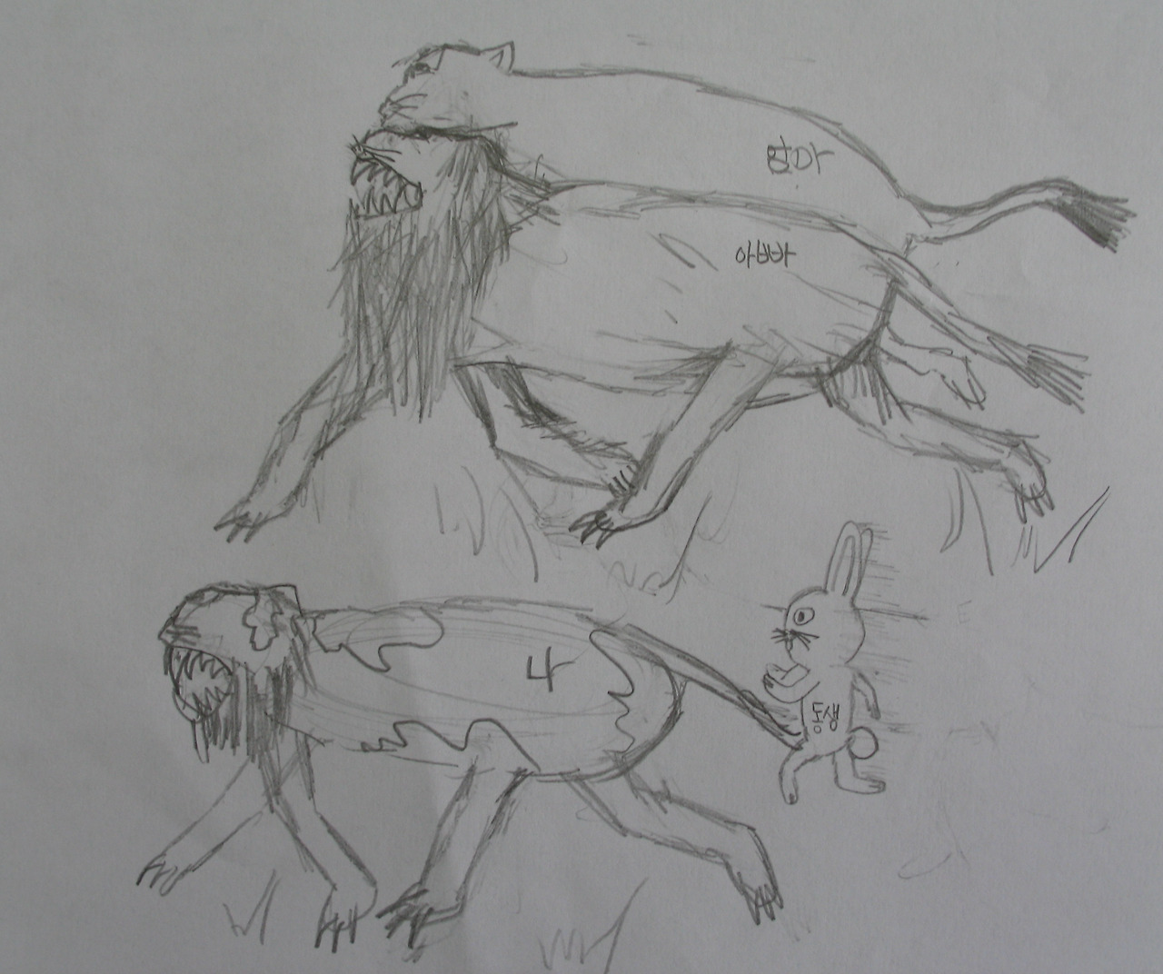 아이들의 그림은 직관적이어서 그림을 잘 살펴보는 것만으로도 많은 것을 유추해 낼 수 있습니다. 다시 위의 그림으로 가서 살펴보면 이 가족의 권력 구조가 보이지 않나요? 제가 보기에 이 가족의 서열 1위는 당연히 아빠입니다. 반면에 엄마는 아빠 사자에 좀 가려져 있죠. 이 그림의 주인공 나는 어떤가요? 엄마보다도 더 돋보이게 그리지 않았나요. 주인공이 생각하는 서열 2위는 '나'가 아닐까요. 주인공 아들은 아빠, 엄마와 나란히 걷고 있고 조금 안쓰러운 남동생 토끼는 뒤에서 열심히 쫓아오고 있네요.