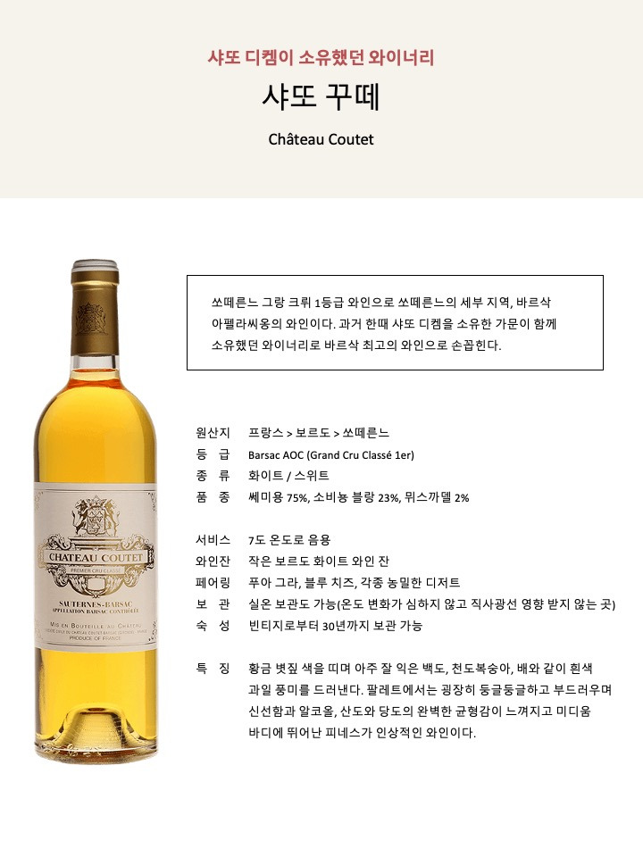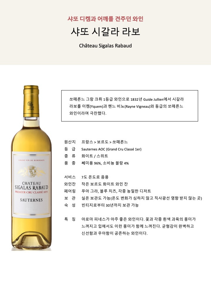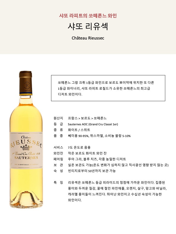 [6] 그레잔 샤르도네(Grézan Chardonnay), 샤또 브라운(Château Brown), 샤또 캡 생 조르주(Château Cap St George), 카름므 드 리유섹(Carmes de Rieussec), 샤또 리유섹(Château Rieussec), 샤또 꾸떼(Château Coutet), 샤또 시갈라 라보(Château Sigalas Rabaud) 모두 와인 이름