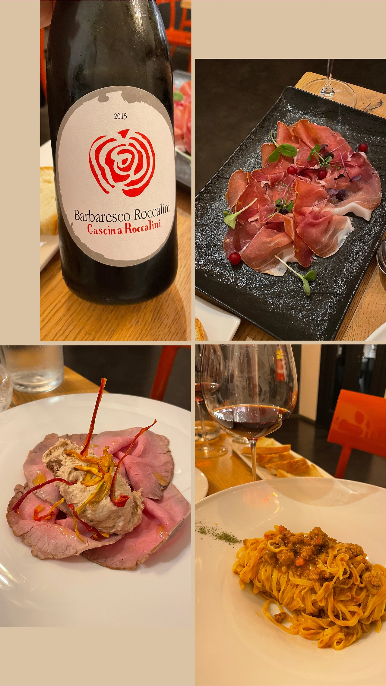 음식을 기다리며 Arneis (피에몬테 지역의 화이트 품종) 한 잔을 마시고, 바르바레스코로 넘어갔다. 일단, 무엇보다도, 와인이 너무 맛있었다. 충격적으로 입맛에 맞아서 둘 다 탄성을 지르며 와인 한 병을 비웠다. 마무리는 라구를 듬뿍 올린 따야린(짜파게티 대신)으로 마무리 후 다시 숙소로 향했다.