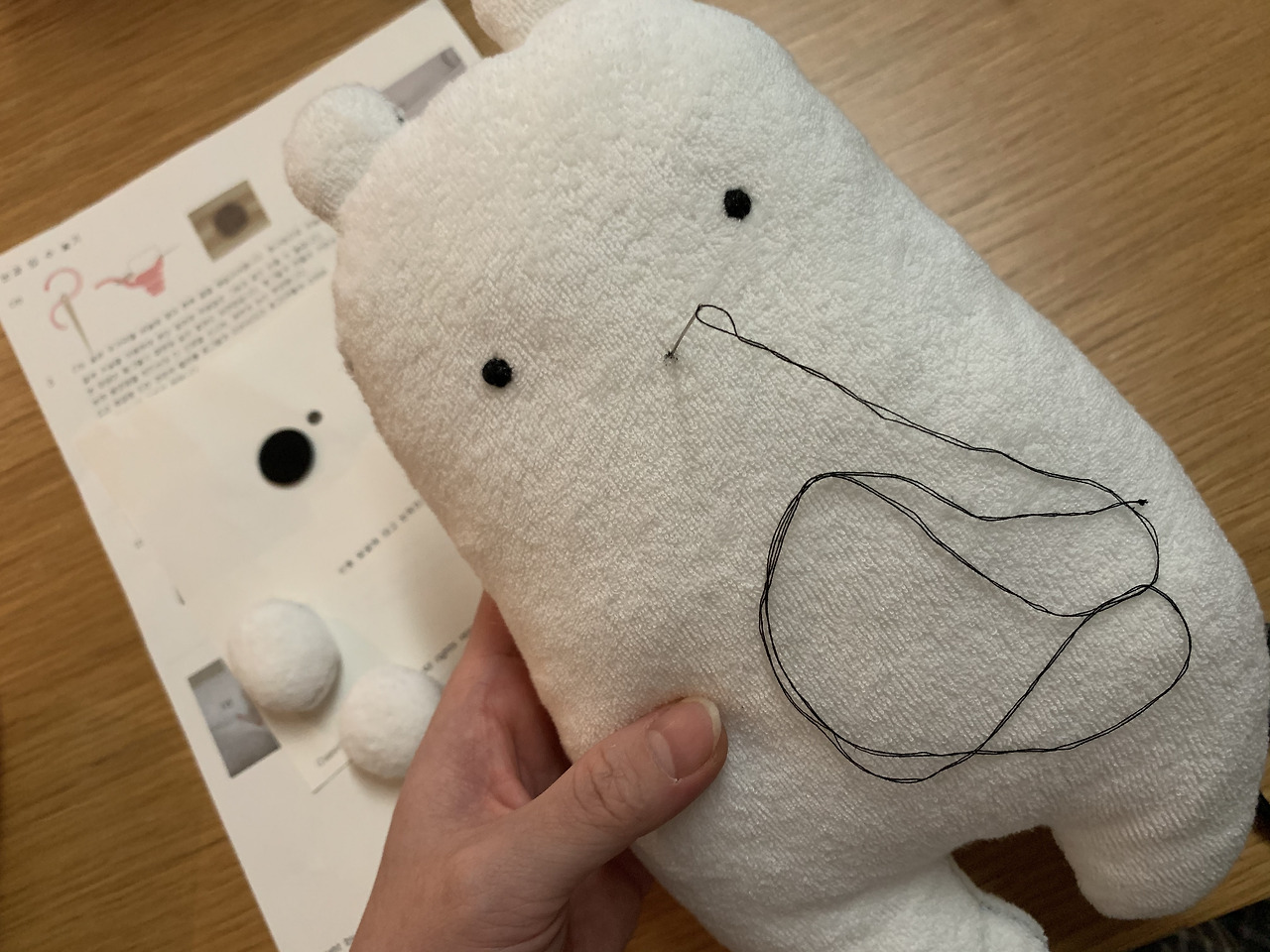 작은 바늘과 정말 얇은 실을 사용하여 손끝으로 하나하나 작업하는게 뭔가 나의 섬세한 신경세포를 아기에게 전달하여 자극해주는 것 같은 느낌도 들었다. 실제로 예비엄마가 손을 자주 사용하는 태교는 두뇌를 자극하는 효과적인 태교법이고 엄마의 심신안정에 도움이 되니 여러모로 좋다고 한다. 그래서 임신 31주차에는 DIY 용품을 직접 찾아 인터넷으로 재료를 주문하여 아기가 사용할 애착인형을 만들기도 했다. 제품 설명서에 따라 천천히 따라하다 보니 어느새 예쁜 인형이 만들어 졌다. 바느질을 하면서 아기에게 말도 걸어주고, 만든 당일날은 아기를 만난 것처럼 만든 인형을 꼭 안고 잠을 잘 정도로 행복한 마음이 충분히 들었기에 바느질태교는 정말 제가 꼭 추천한다.