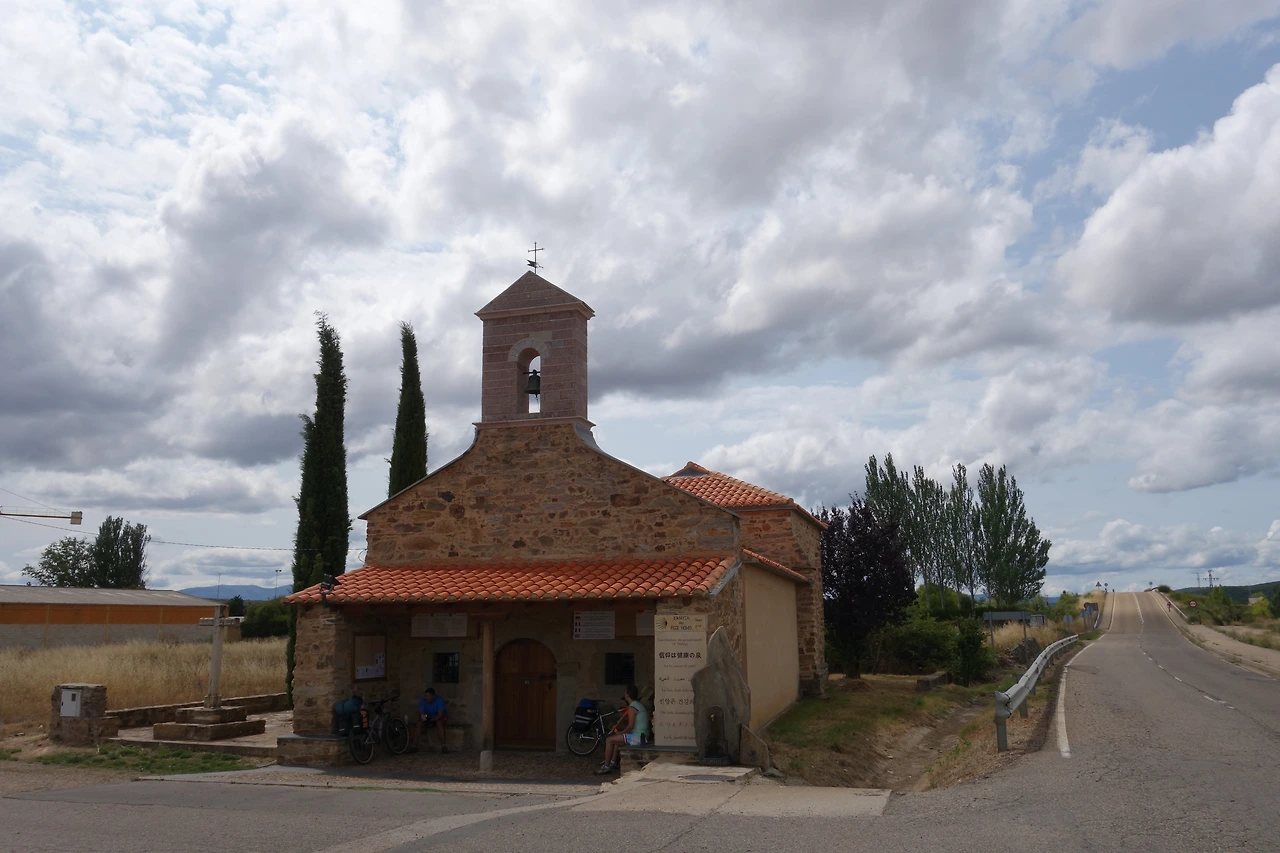 빠스를 떠나보내고 라이오넬과 담배를 한 대 피운 뒤 아스토르가를 떠났다. 슈퍼문이 떠오를 폰세바돈의 철십자가에서 비박을 하려면 오늘은 최대한 폰세바돈 근처 마을까지 이동해야 한다. 부지런히 아스토르가 시내를 빠져나왔다. 어느새 오후 네시. 길 왼편으로 Ermita del Ecce Homo! (Ecce Homo 이 사람이오! : 요한복음 19장5절에 나오는 빌라도의 발언) 라고 쓰인 경당이 하나 나왔다. 경당 입구 간판에는 독일어 등 세계 각국 언어로 쓰여진 "신앙은 건강의 샘" 이라는 글귀가 있다. 물론 한국어로도 쓰여 있다. 그리고 그늘 아래 쉬고 있는 순례자 셋. 둘은 자전거 순례자이고 하나는 도보순례자다.