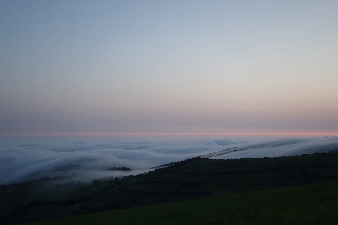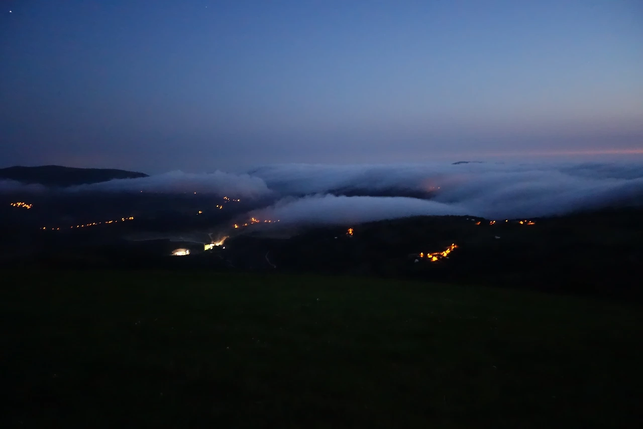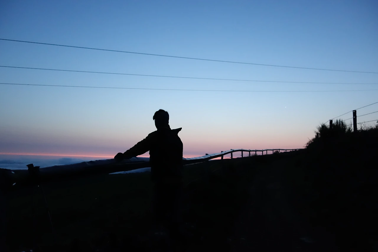 기왕지사, 밤 새 걷는 김에 일출까지 감상하고 가기로 했다. 마침 산 아래로 구름너울이 펼쳐졌다. 그렇게 한참을 산 위에서 보내고 어느 고갯마루 부근에서 해 뜨기를 기다렸다. 장엄한 새벽을 맞이하며 침묵 속에 우리나라와 교황님과 어머니와 가족들을 위해 기도드렸다. 일출이 시작되자 금방 날이 밝아왔다.