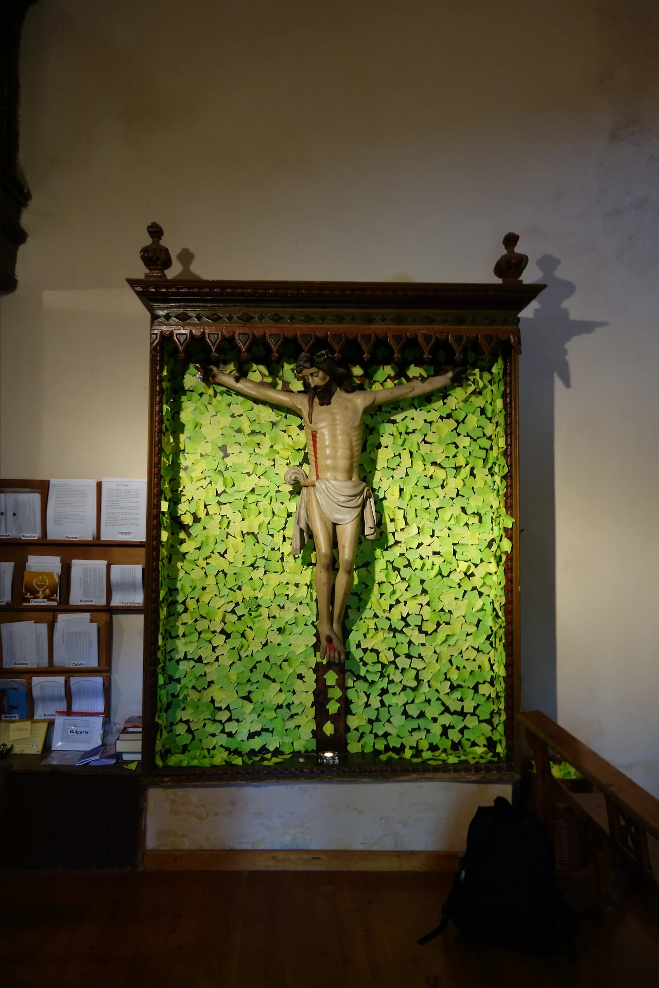 방문자의 국적에 따라 각 언어로 된 순례자 기도문과 순례길의 의미를 담은 인쇄물도 나눠주시는데 나에게도 한글로 된 걸 주셨다. 성당의 제대면에는 십자가에 못박힌 예수그리스도와 성모성심상이 서 있고, 그 주변을 열두 제자가 에워싸고 있다. 다른 벽에는 예수고난상과 화살표 모양의 포스트잇으로 된 순례자들의 소망쪽지들이 가득 붙어 있다.