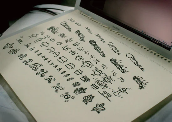 '우리 그냥 빤짝 만나요'라는 재미있는 제목의 작품에는 남녀의 성기 이미지가 언뜻 보인다. 별들도 보이고 하트도 있다. 산수화에 비해 살짝 난해한 작품이다. 언뜻 서로 관계가 없어 보이는 이미지들은 무얼 말하는 걸까? 작가는 대답 대신 “재밌는 거 보여줄게요”라고 말하며 주섬주섬 박스 하나를 열어 보인다. 거기엔 그의 아이디어 스케치가 들어 있다. 스케치는 마치 선생님이 숨겨 놓은 해답지처럼 수수께끼 같은 작품의 실마리가 담겨 있다. 어떻게 글자가 그림으로 변하는지, 그림이 또 어떤 연상으로 글씨로 변하는지 그려져 있다. 예를 들면 처음엔 ‘제프월’이라는 독일 사진작가의 이름으로 시작된다.