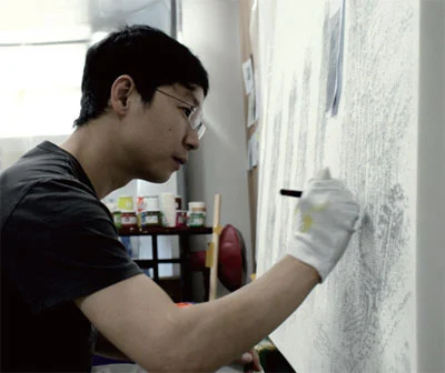 그는 작은 글씨를 계속 써나가며 그림을 그린다. 이런 작품을 그리는 작가는 어떤 남자일까? 그가 좋아하는 소설책은 뭘까? 작품을 보다보니 사람이 궁금해졌다.