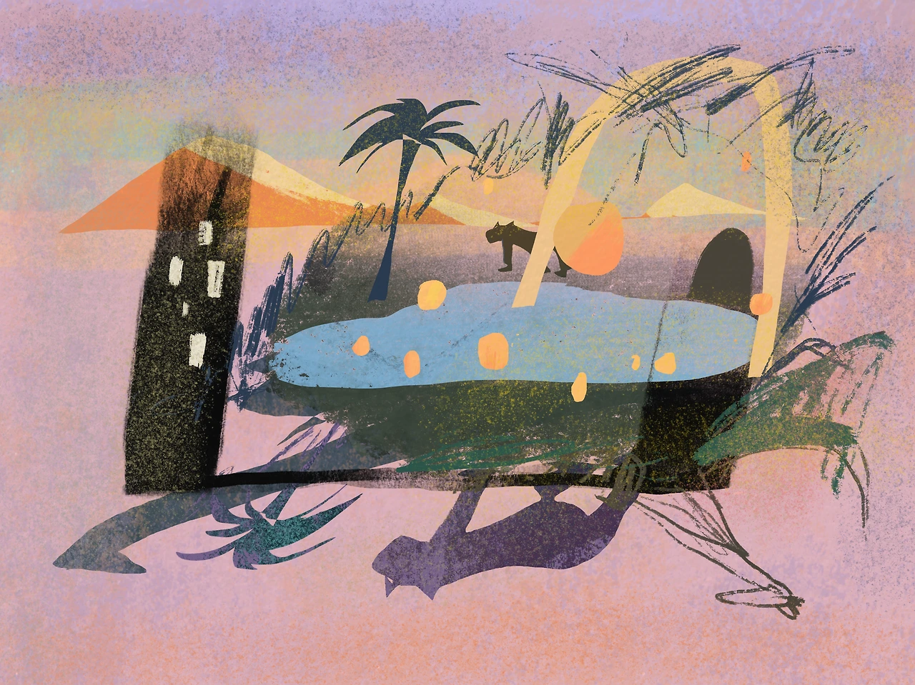 밤이 되자 공기가 좀 서늘해졌다. 금 간 기둥이나 벗겨진 페인트도 그림자 속에 숨었다. 조명이 켜지자 호텔은 그제야 진짜 자기의 모습을 드러냈다. 촌스럽던 핑크색 외벽은 검푸른 저녁 공기와 닿으며 묘한 보라색으로 변했다. 둥그런 수영장 위로 알전구들이 조르륵 켜지자 버려진 것 같았던 동물조각들이 살아있는 것처럼 보였다. 팝업북처럼 정글의 실루엣이 일제히 고개를 들었다. 마치 루소의 그림 속 원시림에 들어와 있는 것 같았다.