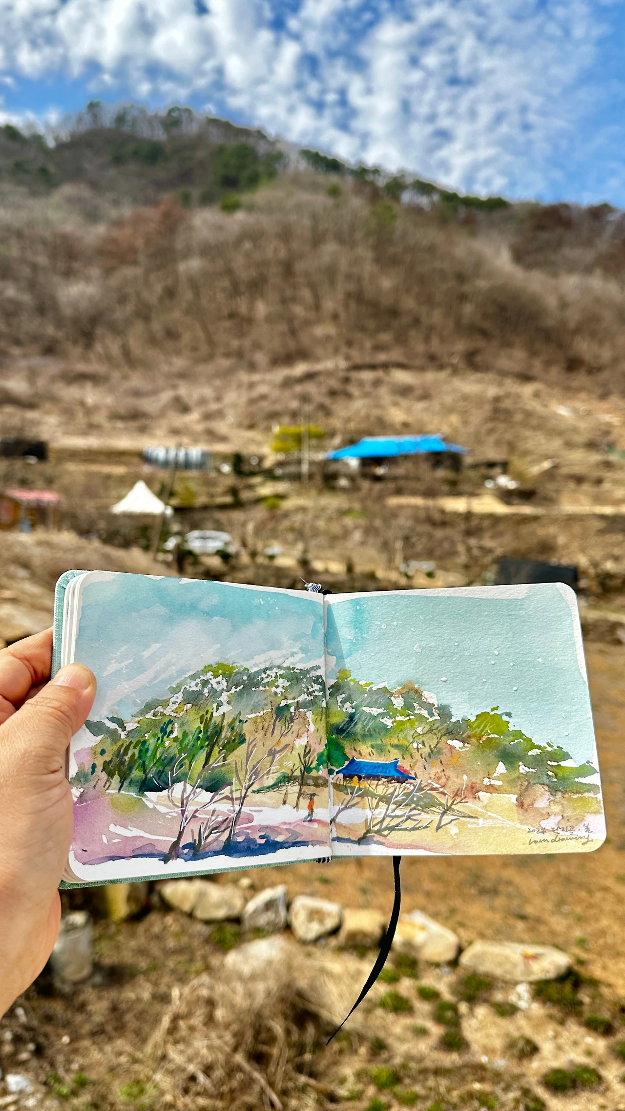 아직 아무것도 없어 뵈는 흙밭에도 자세히 보면 겨울을 나 더 달콤해진 나물거리들이 숨었단다. 깨끗한 채소에 열광하는 엄마는 그 봄 것을 맘껏 캐 가라는 아저씨의 말씀에 놀이터에 온 아이처럼 쪼그려 앉아 흙을 뒤집고, 떠날 날이 다 되어서야 정신이 좀 든 나는 커피를 마시며 비로소 창 밖을 감상한다. 초록은 아직인 베이지 모노톤의 소백산. 그러나 자세히 보면 은밀하고도 소란한 봄기색이 느껴진다. 그렇게 달콤한 멍타임에 잠겨있는데 저만치 아들이 엄마 엄마를 외치며 달려온다. 흔들리던 이가 마침내 빠졌노라고.