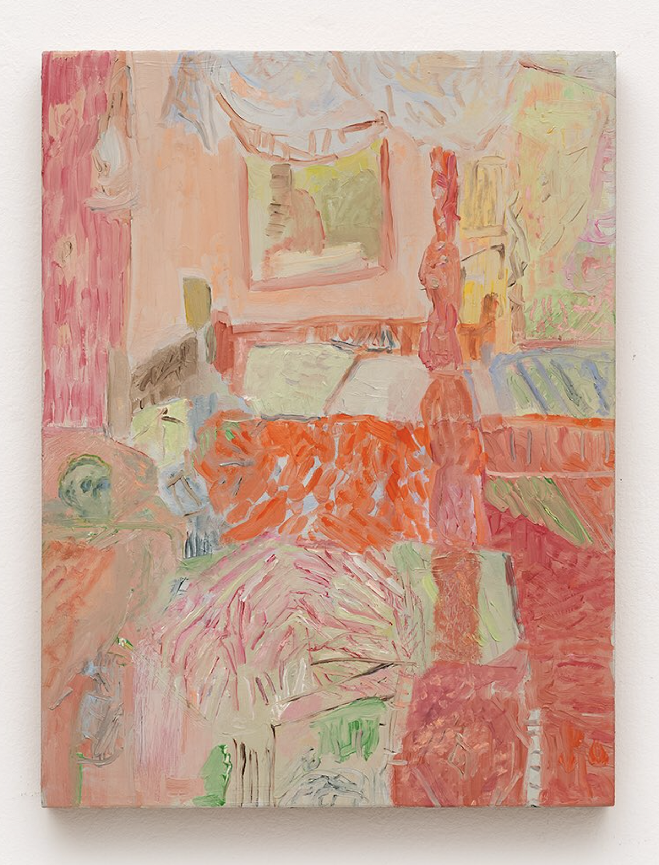 작가는 형태를 일부러 자세히 표현하지 않았다. 그러나 뭉개진 형태를 보고도 이곳이 실내이고, 침실임을 대략 상상할 수 있다. 벽에는 바깥 어딘가를 향해 앉은 누드화처럼 보이는 그림이 걸려있고, 휘장이 달린 침대가 있으며, 하얀 배게, 그 옆에는 테이블이 있다. 원근감이나 명암의 차이도 없다. 이 방에는 틀림없이 수많은 색들이 있었겠지만, 작가는 많은 요소들을 지우고 오직 분홍들이 풍기는 분위기에 집중했다.