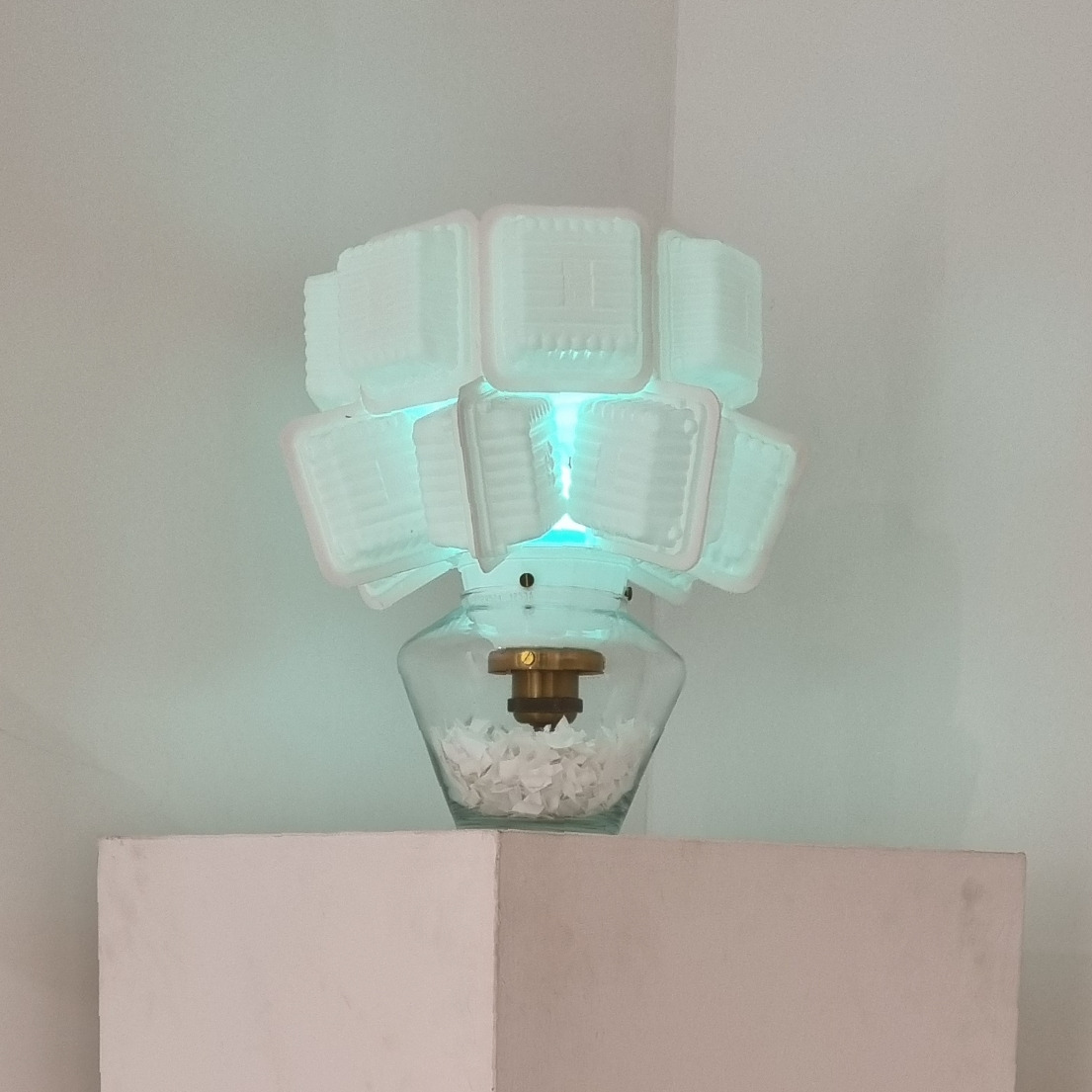낫또 용기 28개를 사용하여 꽃다발을 형상을 만들고 내부에 자동으로 색이 바뀌는 LED 램프를 내부에 탑재하여 꽃이 가지는 다채로운 색상을 연출한 업사이클링 칼라 조명이다.