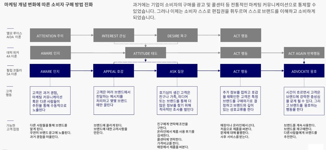5A 이론은 최근 마케팅 개념 변화에 따른 소비자 구매 방법의 진화를 설명하기 위해 참고한 개념으로, 인지 -> 호감 -> 질문 -> 행동 -> 옹호의 5 단계로 소비자가 브랜드를 스스로 이해하고 소비하게 만들어야 한다는 것이 주요 포인트이다.