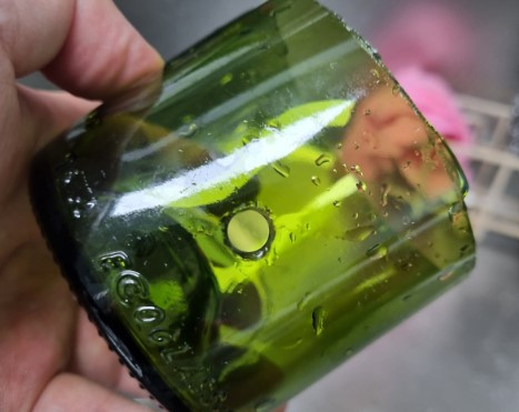 3. 절단된 와인 병 하부 유리에 전원케이블이 통과할 수 있도록 다이아몬드 홀쏘를 장착한 전동 드릴을 이용하여 구멍을 뚫어 준다.