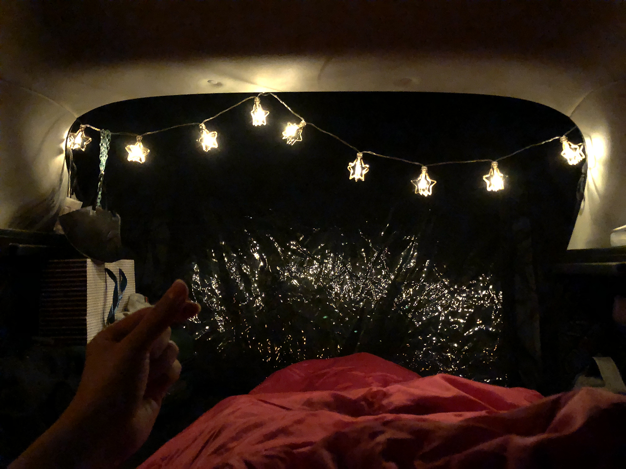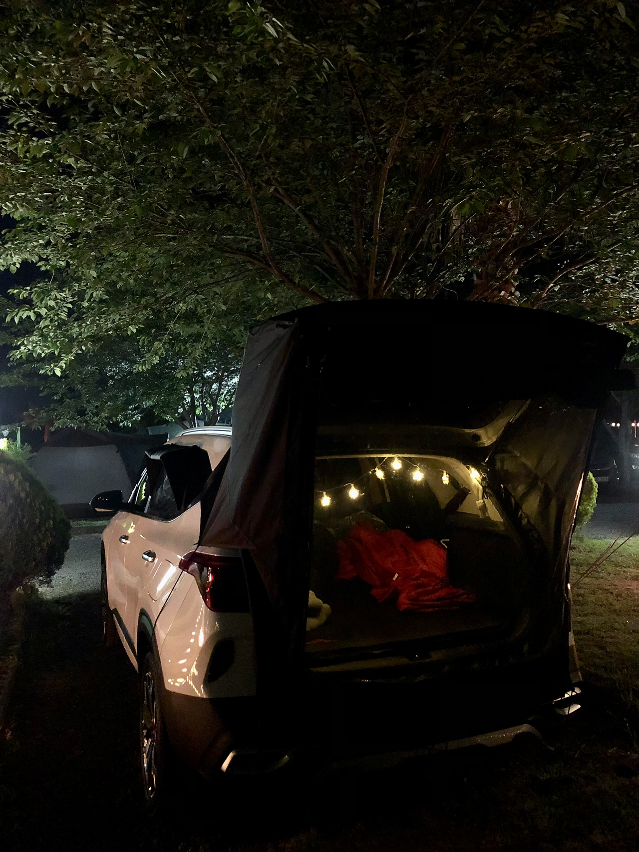 나는 제일 먼저 트렁크를 열어 꼬리 텐트를 설치하고 입구 안쪽에 별 모양의 예쁜 조명을 달았다. 접힌 시트 위에는 편히 잠을 잘 수 있도록 푹신한 매트를 깔았고, 자동차 천장 손잡이에 랜턴을 달아 한껏 분위기를 냈다. 랜턴은 블루투스 스피커 겸용이었는데 잔잔한 재즈곡을 틀어두니 생각보다 근사하고 아늑한 아지트가 만들어졌다. 이날 날씨가 좀 쌀쌀해서 침낭 안에 핫팩을 넣고 잤는데 텐트 안에서 잔 일행들보다 내가 더 꿀잠을 잤다는 사실에 기분이 좋기도 했다. 내 아지트가 얼마나 괜찮은지 증명할 수 있었으니까.